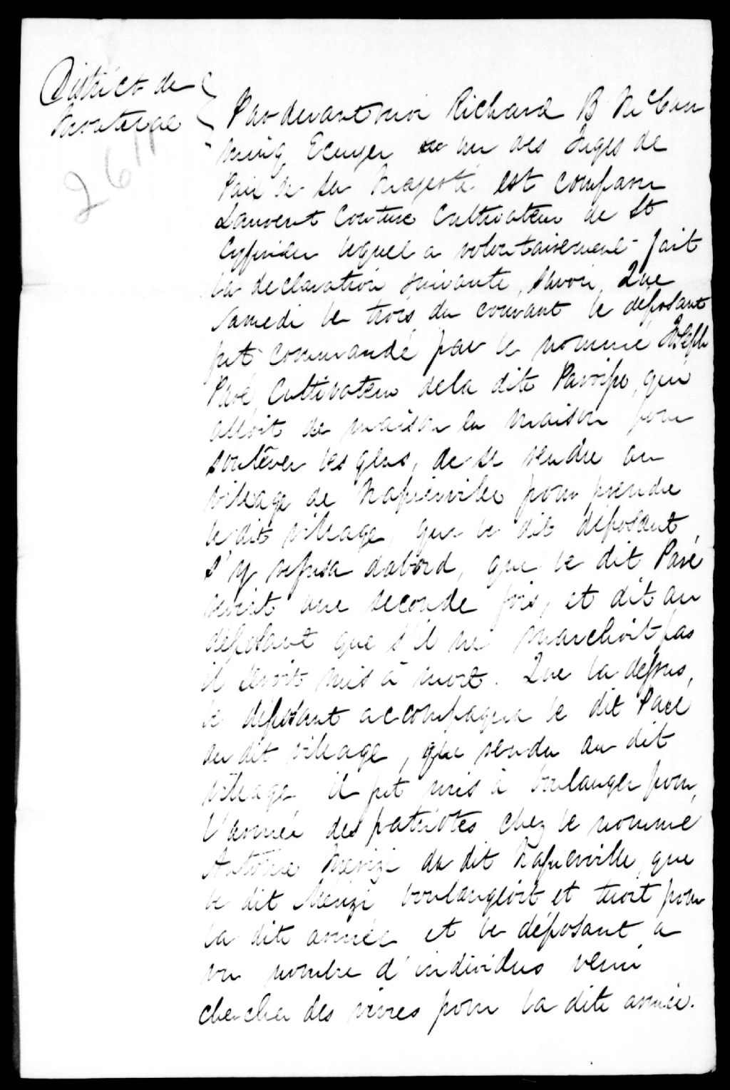 Déposition de Laurent Couture contre Joseph Paré et Antoine Merizi, 21 novembre 1838, Archives nationales à Québec, Fonds Ministère de la Justice, (03Q,E17,S37,D2611).
