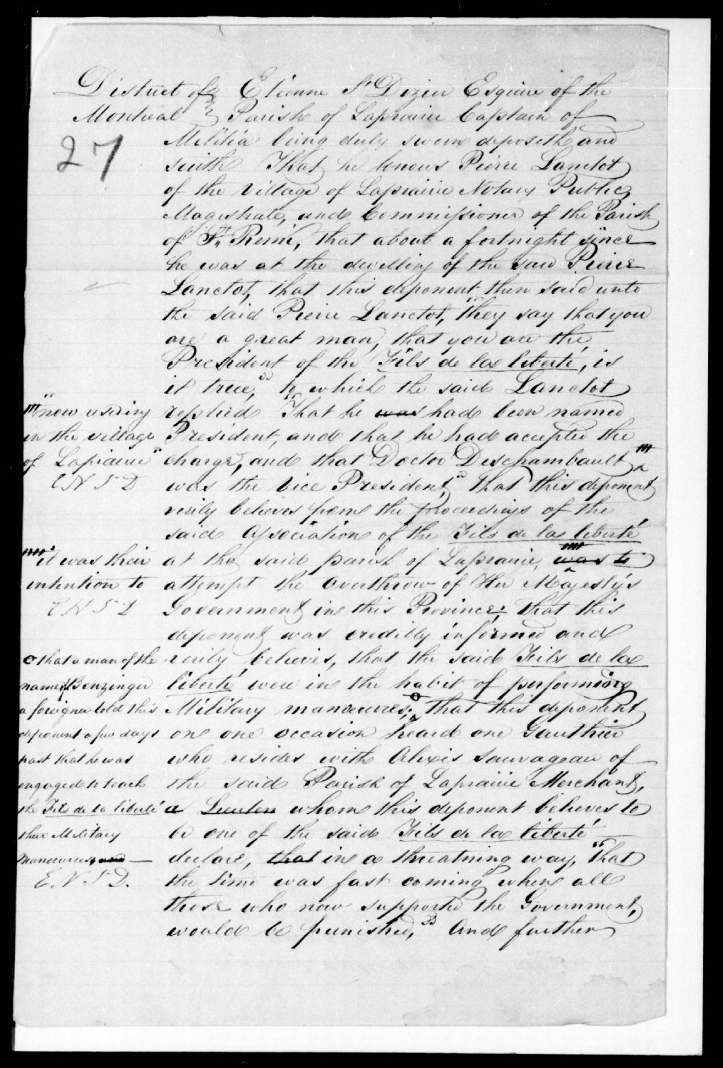 - Le déposant déclare qu'il existait une association des Fils de la Liberté à Laprairie, que Pierre Lanctôt en était le président, le docteur Archambault, le vice-président, et qu'on y faisait des exercices militaires. Ce dossier fait partie d'un ensemble de documents intitulé : Les Fils de la Liberté