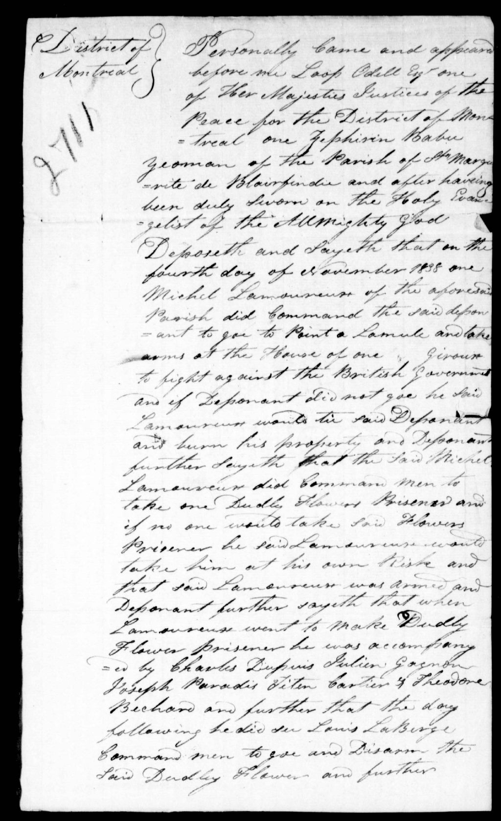 Déposition de Zéphirin Babeu (Babu), de Sainte-Marguerite-de-Blairfindie, contre Michel Lamoureux, Charles Dupuis, Julien Gagnon, Joseph Paradis, Titen (Titien) Cartier, Théodore Béchard et Louis Laberge, novembre 1838, Archives nationales à Québec, Fonds Ministère de la Justice, (03Q,E17,S37,D2711).