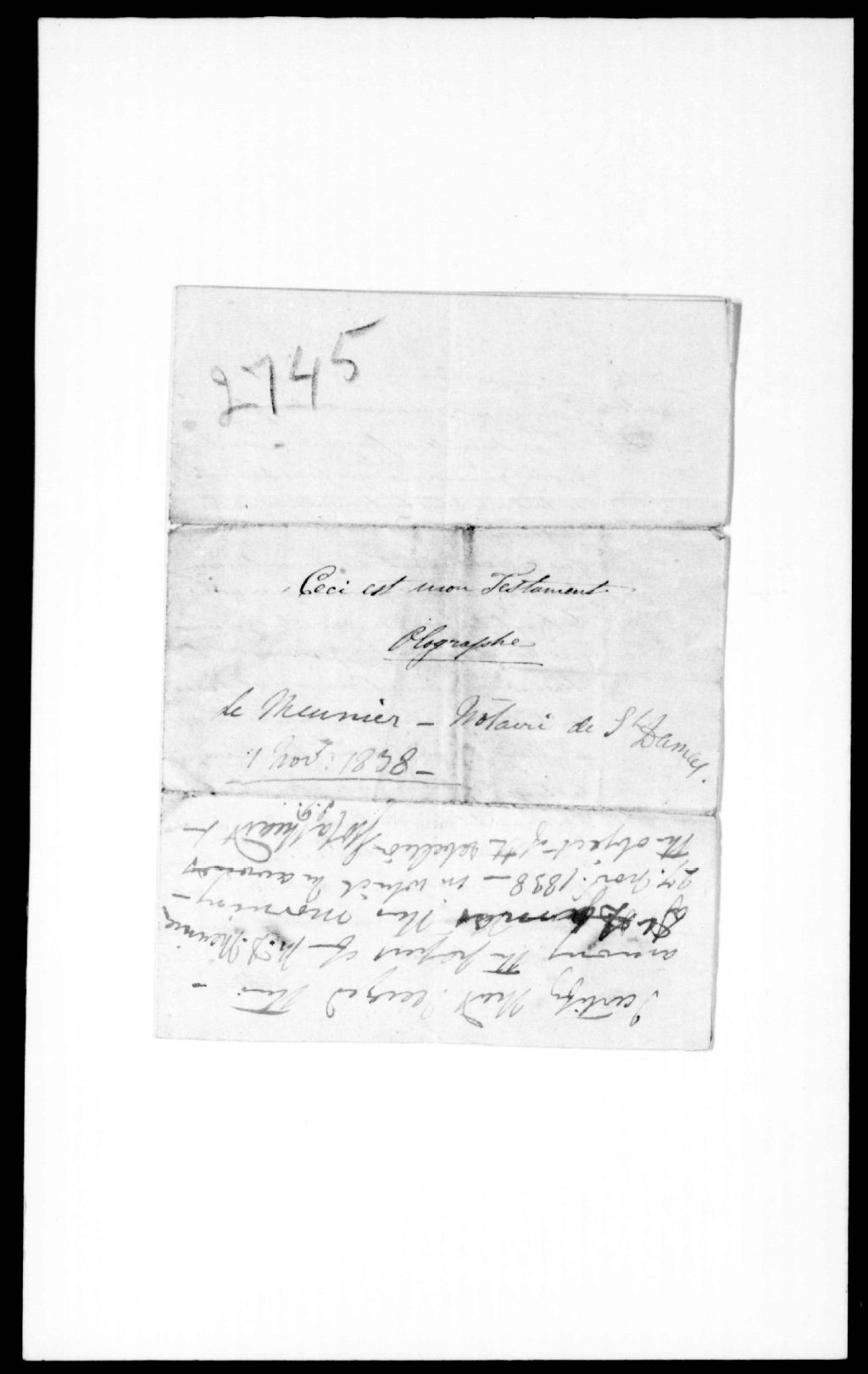 Testament olographe de Mathias-D. Meunier, notaire de Saint-Damase