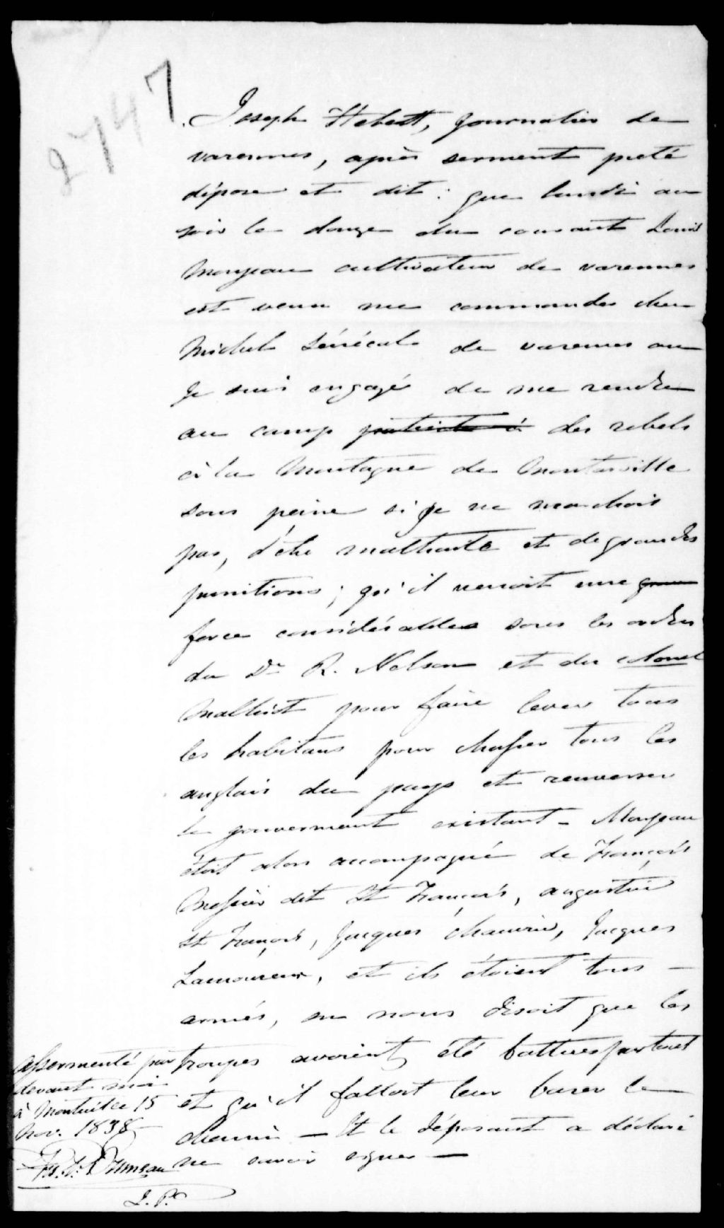 Déposition de Joseph Hébert contre Louis Monjeau, de Varennes, 15 novembre 1838, Archives nationales à Québec, Fonds Ministère de la Justice, (03Q,E17,S37,D2747).