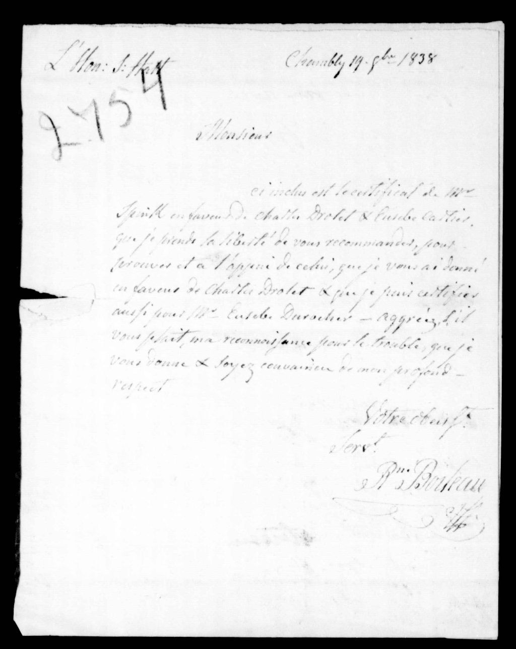 Lettre de René Boileau à l'honorable Samuel Hart, datée de Chambly