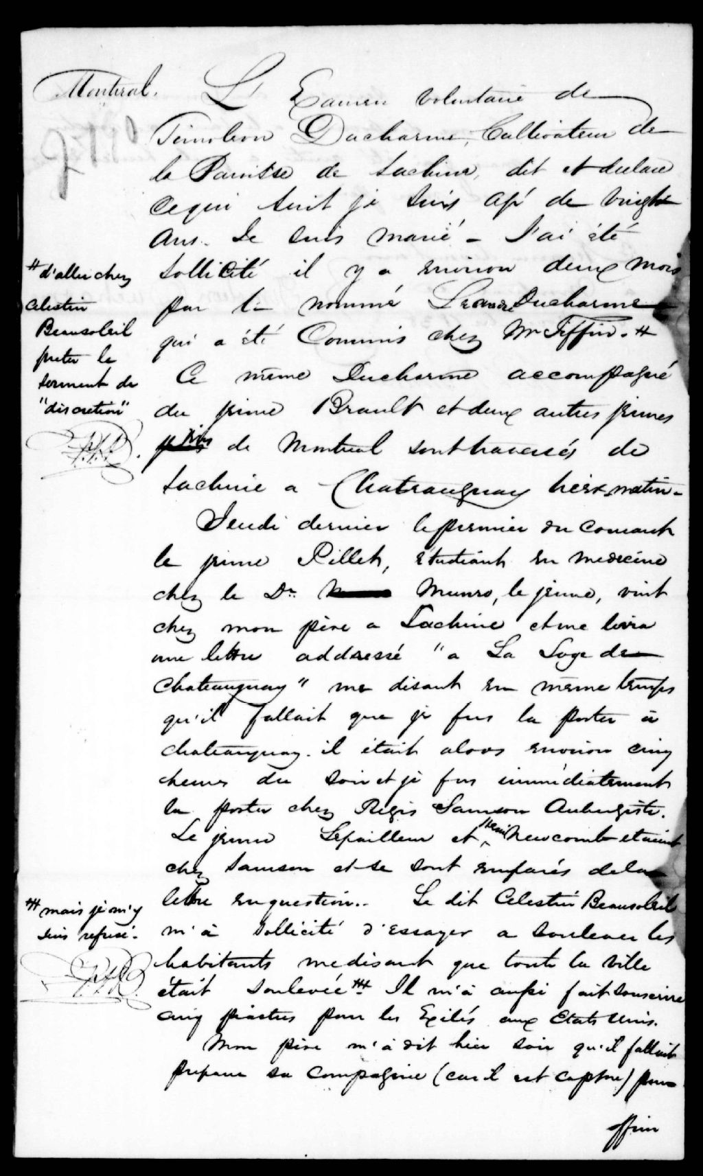 Examen de Timoléon Ducharme, de Lachine, 5 novembre 1838, Archives nationales à Québec, Fonds Ministère de la Justice, (03Q,E17,S37,D2790).