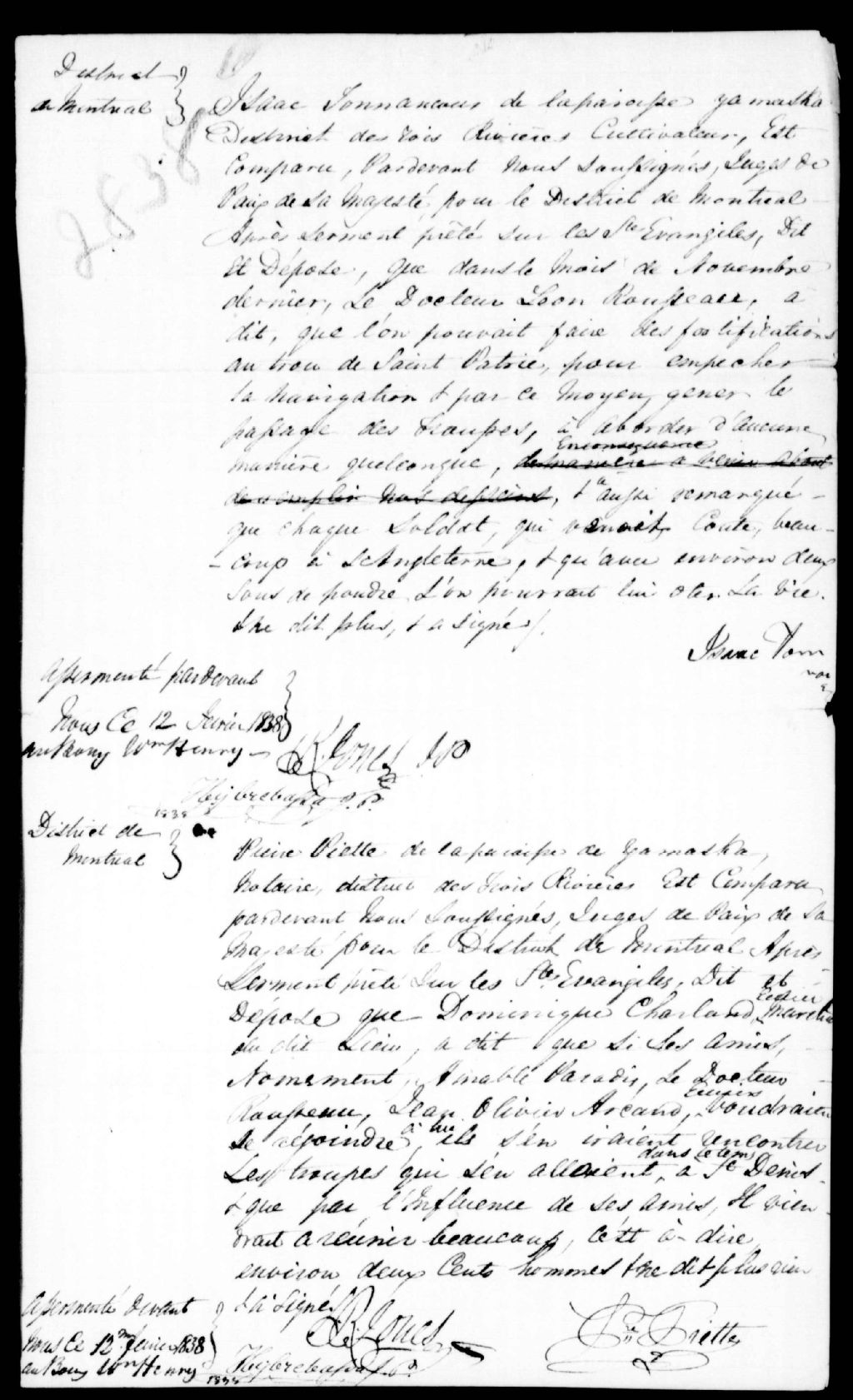 Déposition d'Isaac Tonnancour et de Pierre Piette contre Jean-Olivier Arcand, arpenteur, le docteur Léon Rousseau, Dominique Charland. Amable Paradis, Pierre-Joseph Chèvrefils, notaire d'Yamaska