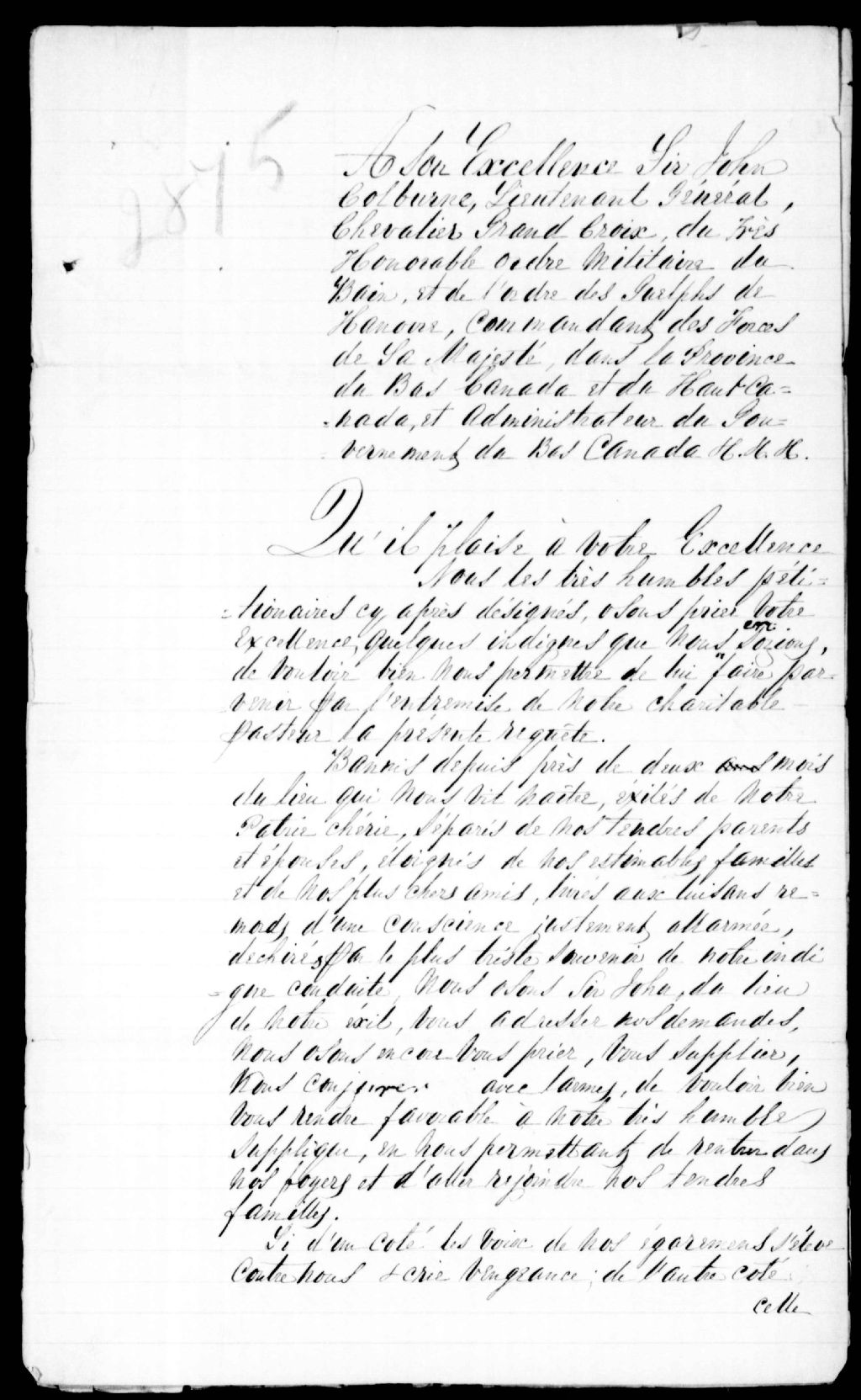 Requête à sir John Colborne de plusieurs réfugiés à Corbeau, État de New York