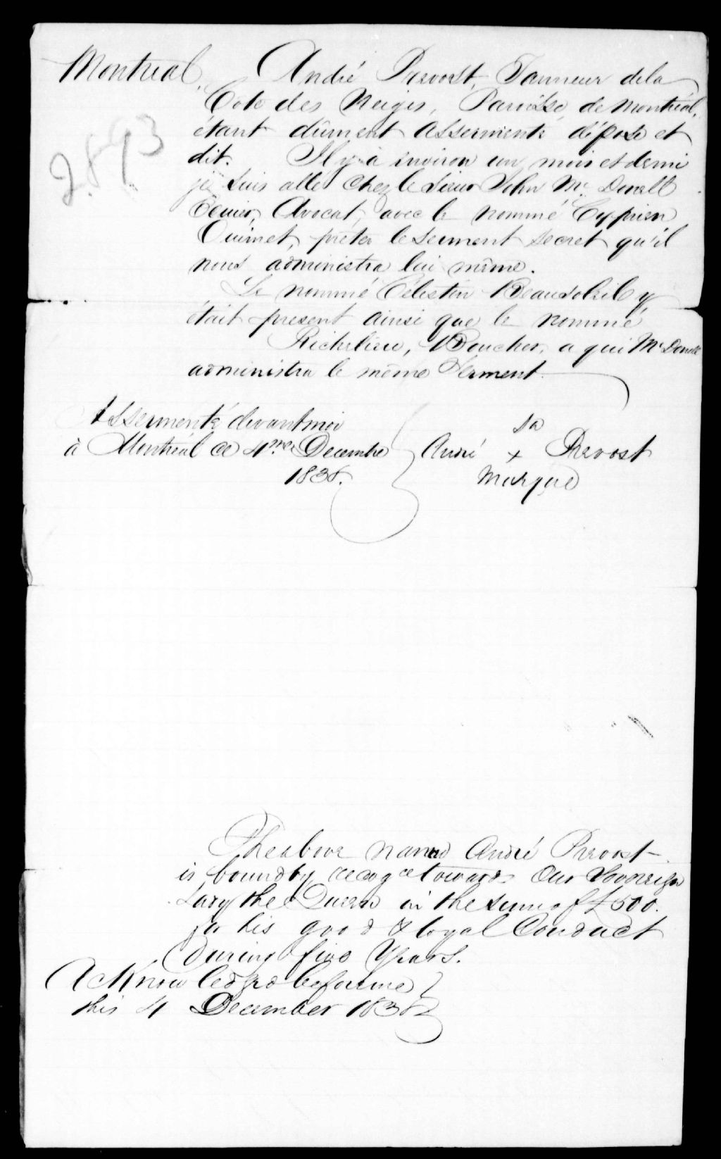 Déposition d'André Prévost contre John McDonell, avocat, de Montréal, 4 décembre 1838, Archives nationales à Québec, Fonds Ministère de la Justice, (03Q,E17,S37,D2893).