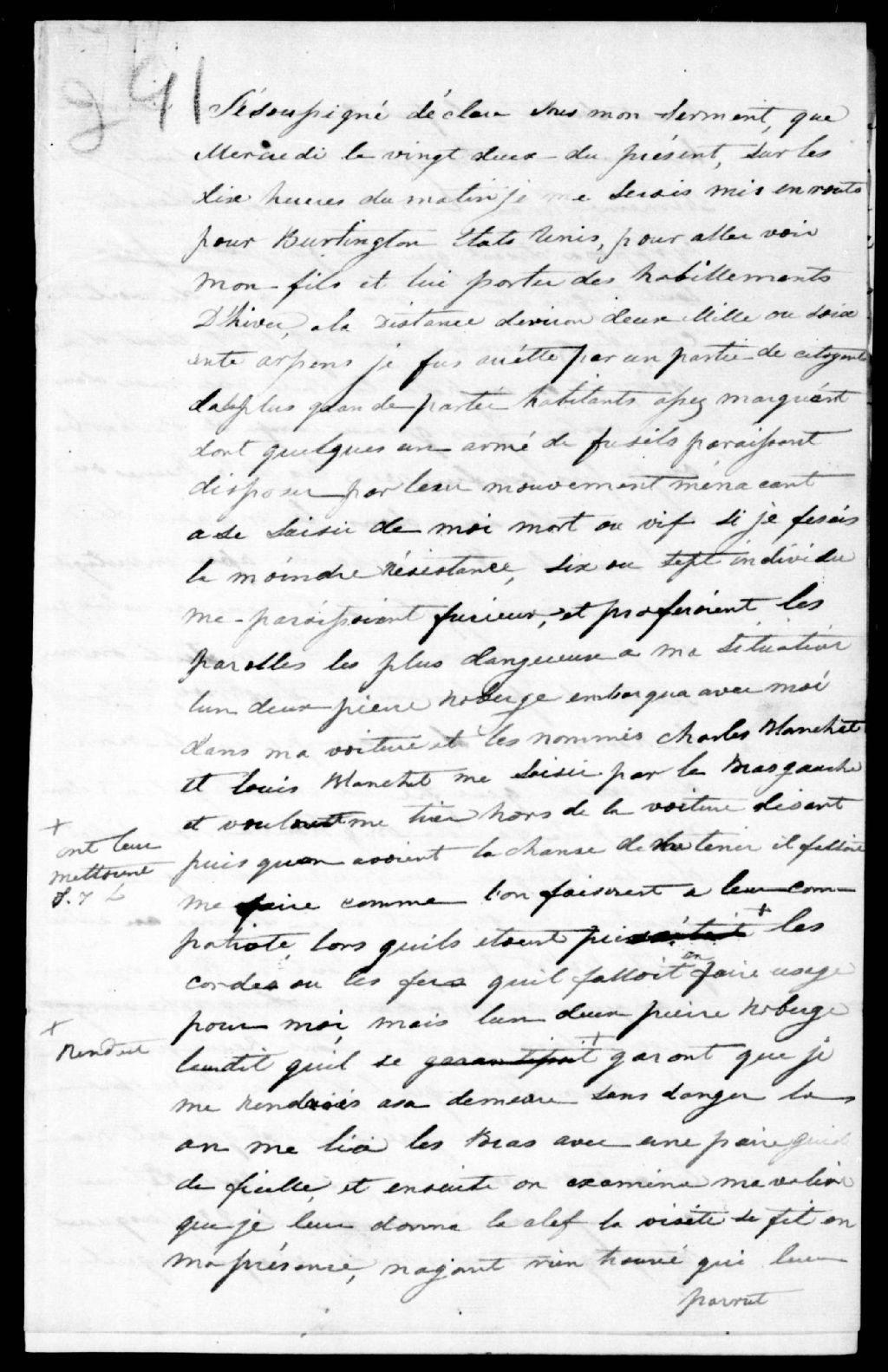 - Le déposant raconte les circonstances de son arrestation. Détails intéressants relatifs au combat de Saint-Charles, à Thomas Storrow Brown et Rodolphe Desrivières. Ce dossier fait partie d'un ensemble de documents intitulé : Etat des esprits (1837), Renvois de commissions - charivaris - attaques à main armée - assemblées de protestation - batailles de Saint-Denis et de Saint-Charles