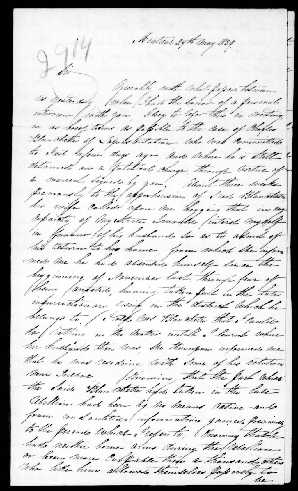 Lettre de Peter Spink à Pierre-Édouard Leclerc, chef de police à Montréal, datée de Montréal, 27 mai 1839, Archives nationales à Québec, Fonds Ministère de la Justice, (03Q,E17,S37,D2914).