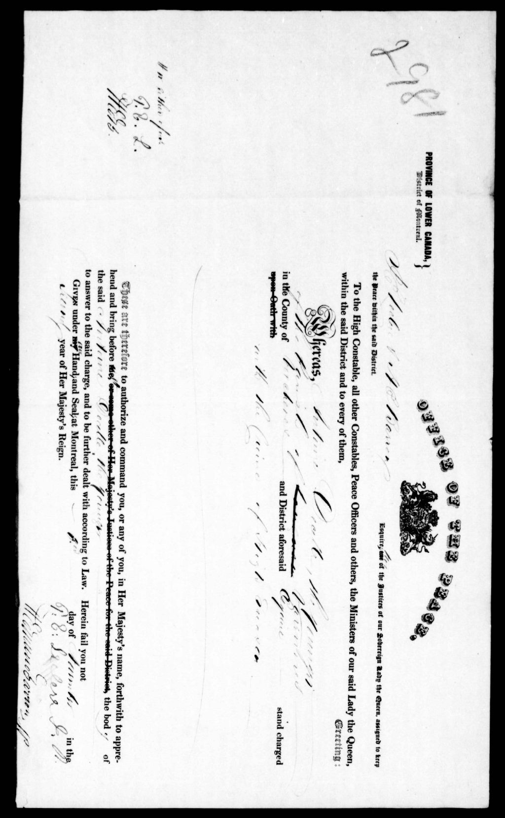 Mandat d'arrestation émis par Pierre-Édouard Leclerc, surintendant de la police, à Montréal, contre Antoine Decelles le jeune, de Varennes, 3 novembre 1837, Archives nationales à Québec, Fonds Ministère de la Justice, (03Q,E17,S37,D2981).