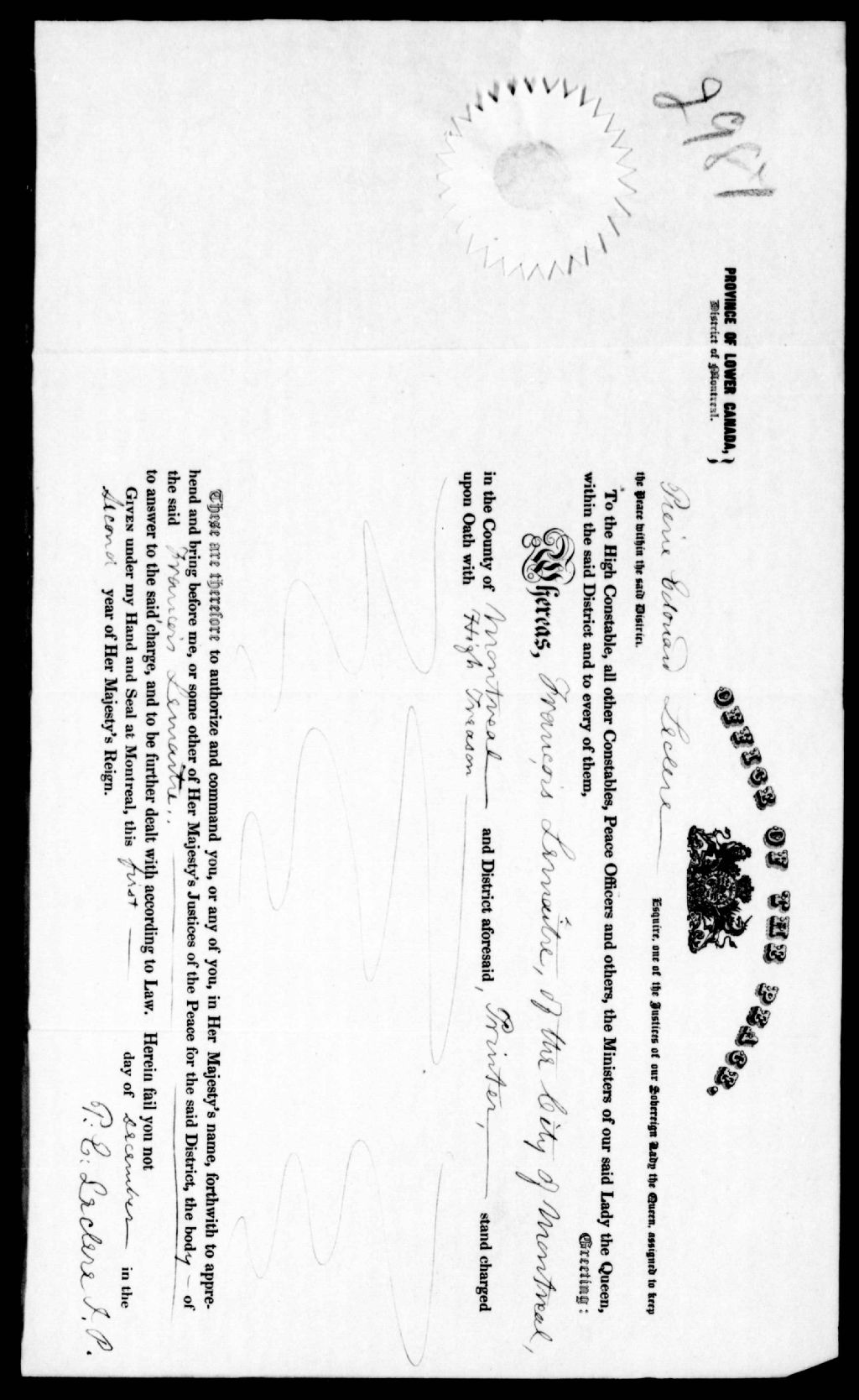- Mandat d'arrestation émis par Pierre-Édouard Leclerc, surintendant de la police, à Montréal, contre François Lemaître, de Montréal