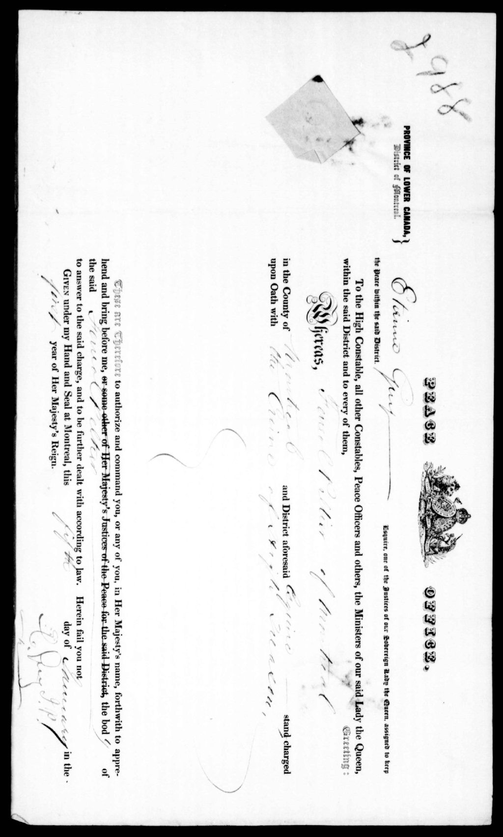 Mandat d'arrestation émis par Pierre-Édouard Leclerc, surintendant de la police, à Montréal, contre Ferréol Peltier, de Montréal, 5 janvier 1837, Archives nationales à Québec, Fonds Ministère de la Justice, (03Q,E17,S37,D2988).