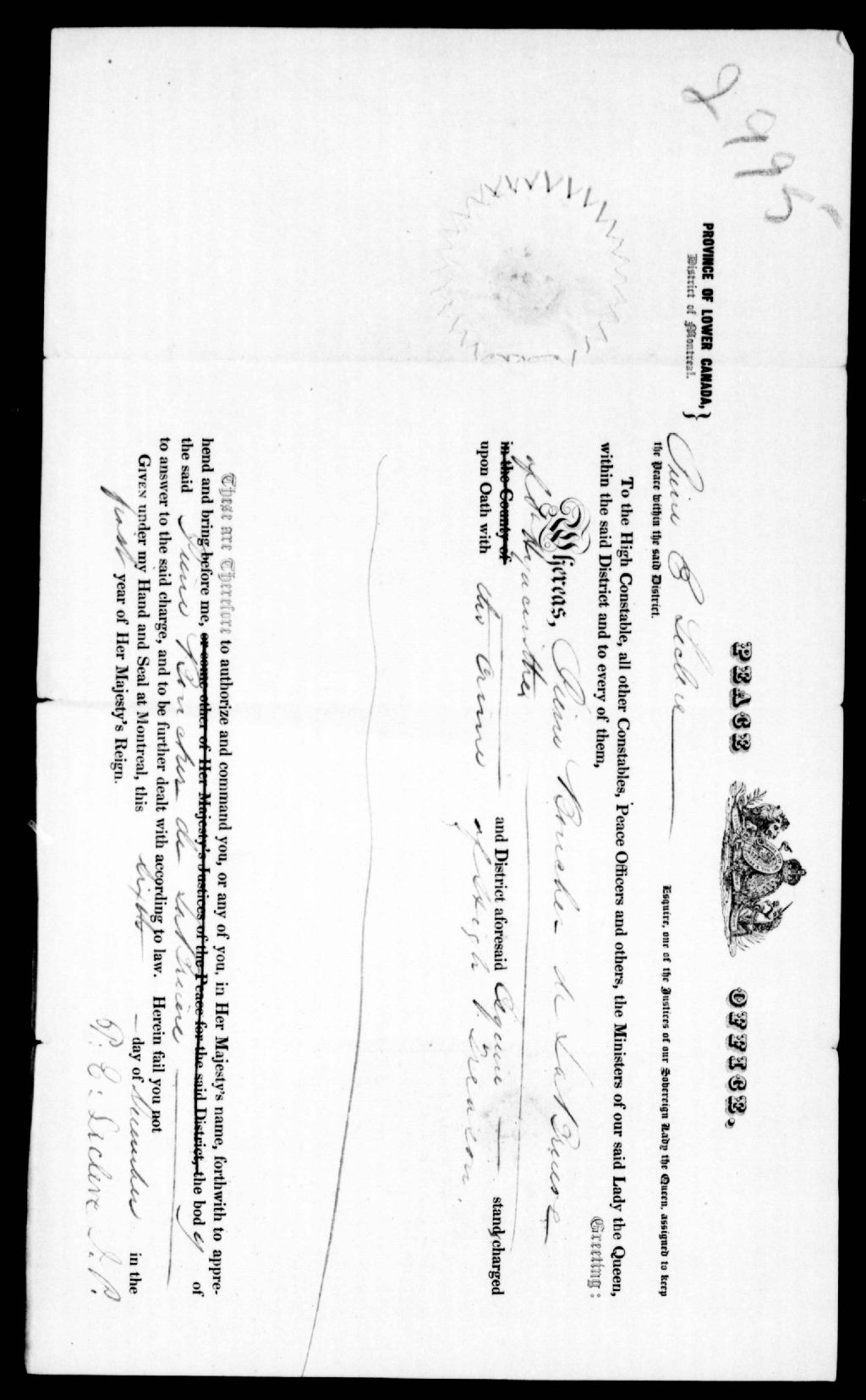 Mandat d'arrestation émis par Pierre-Édouard Leclerc, surintendant de la police, à Montréal, contre Pierre Boucher de La Bruère, de Saint-Hyacinthe, 6 décembre 1837, Archives nationales à Québec, Fonds Ministère de la Justice, (03Q,E17,S37,D2995).