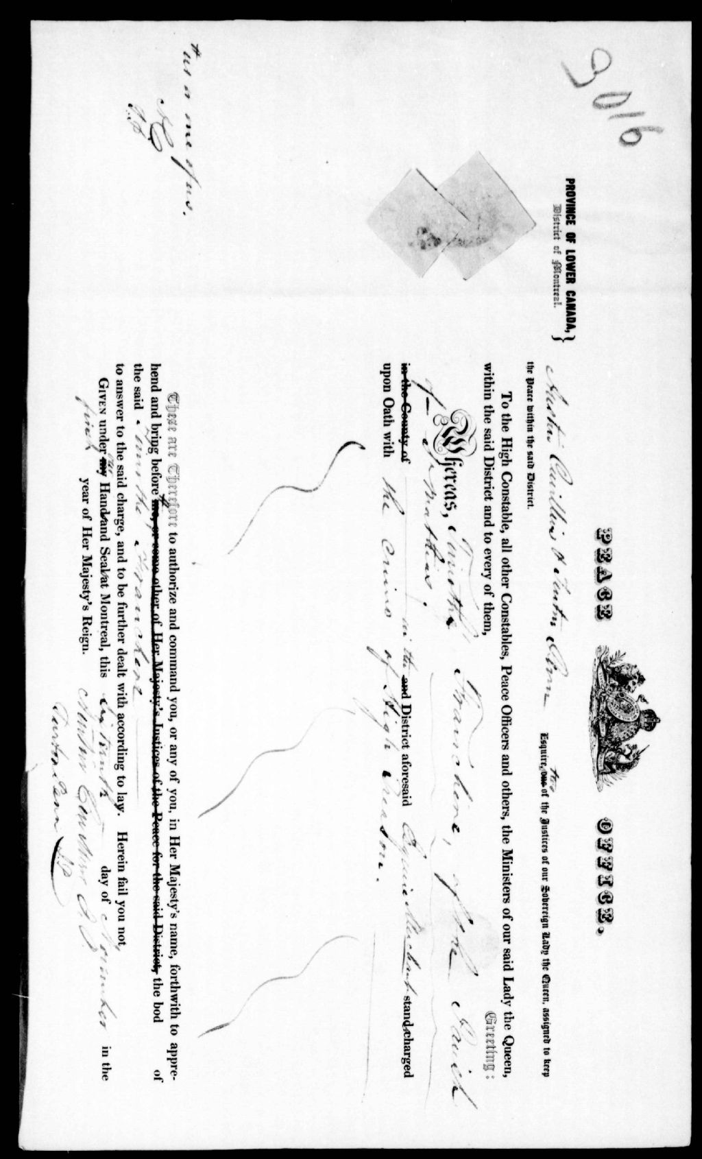 Mandat d'arrestation émis par Austin Cuvillier et Turton Penn contre Timothée Franchère, de Saint-Mathias, 16 novembre 1837, Archives nationales à Québec, Fonds Ministère de la Justice, (03Q,E17,S37,D3016).