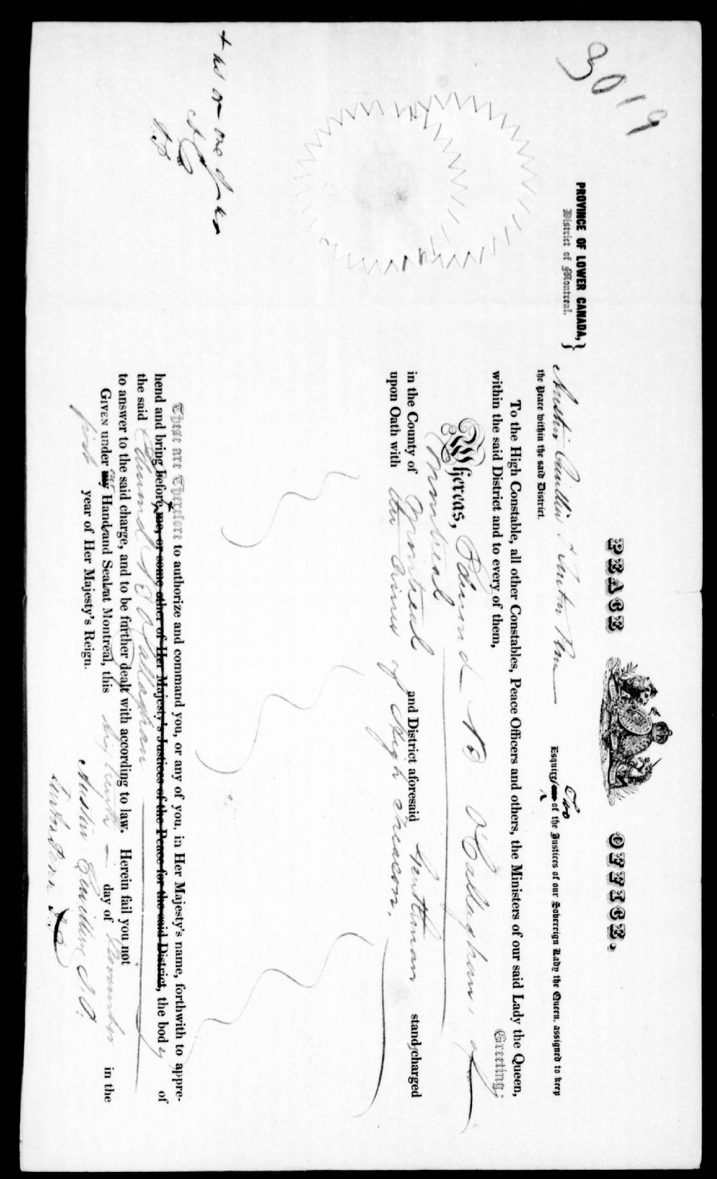 Mandat d'arrestation émis par Austin Cuvillier et Turton Penn contre Edmund B. O'Callaghan, de Montréal, 16 novembre 1837, Archives nationales à Québec, Fonds Ministère de la Justice, (03Q,E17,S37,D3019).