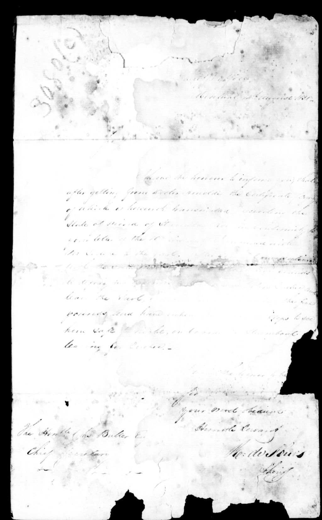 Lettre de Roch de Saint-Ours à Charles Buller, 14 août 1838, Archives nationales à Québec, Fonds Ministère de la Justice, (03Q,E17,S37,D3080C).