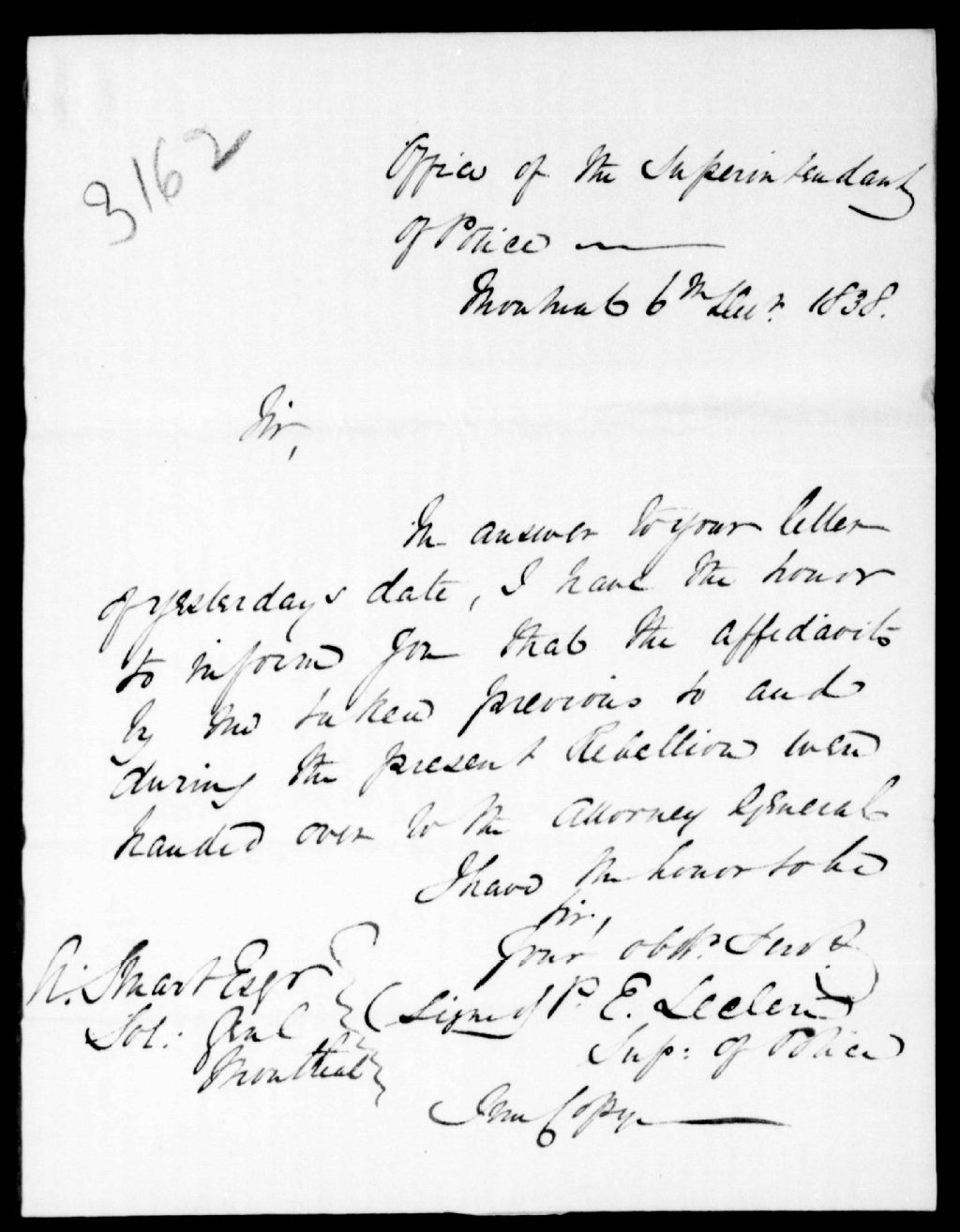 Copie d'une lettre de P.-E. Leclerc à Andrew Stuart, 5 décembre 1838, Archives nationales à Québec, Fonds Ministère de la Justice, (03Q,E17,S37,D3162).