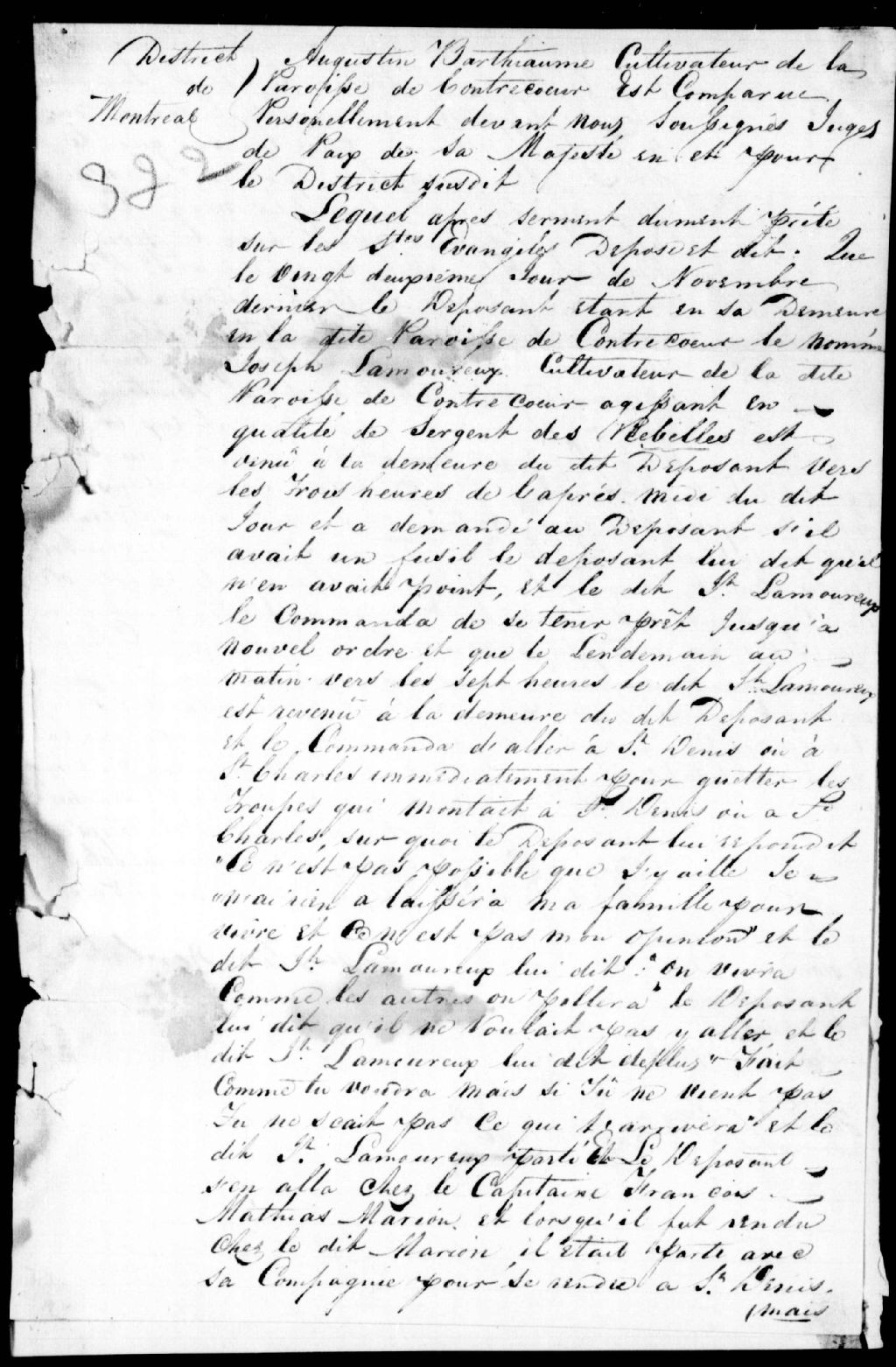 - Le déposant déclare que le 28 novembre 1837, Joseph Lamoureux, de Contrecoeur, agissant comme sergent des rebelles, lui ordonna de se rendre à Saint-Denis pour combattre les troupes anglaises. Ce dossier fait partie d'un ensemble de documents intitulé : Etat des esprits (1837), Renvois de commissions - charivaris - attaques à main armée - assemblées de protestation - batailles de Saint-Denis et de Saint-Charles