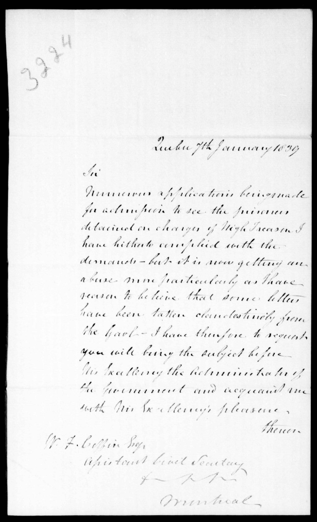 Lettre de Thomas Ainslie Young, chef de police à Québec, à William Foster Coffin, sous-secrétaire, 7 janvier 1839, Archives nationales à Québec, Fonds Ministère de la Justice, (03Q,E17,S37,D3224).