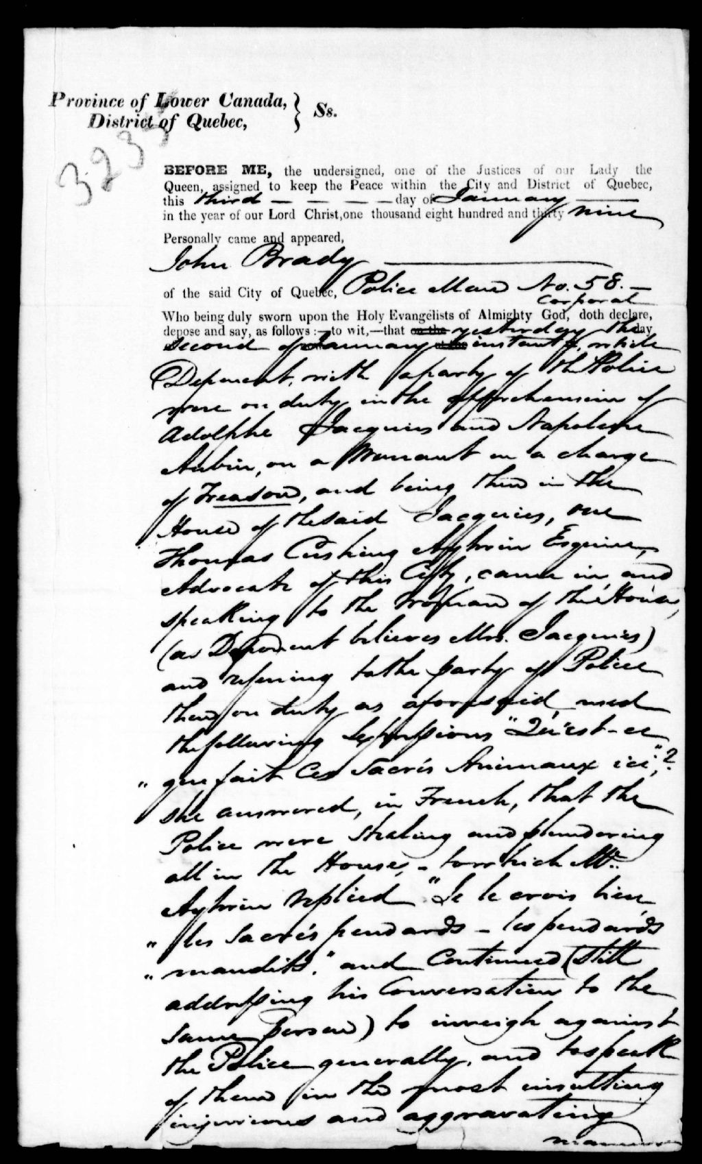 Déposition de John Brady, homme de police, contre Thomas Cushing Aylwin, avocat