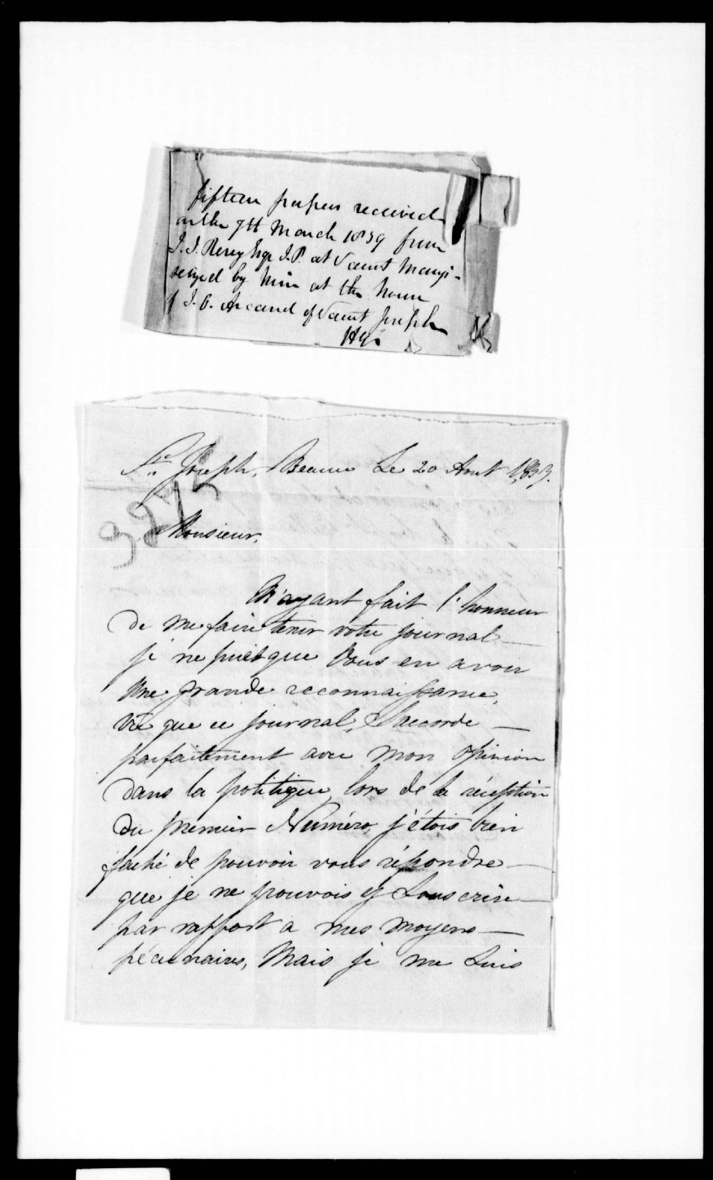 - Lettre de Caïus Arcand à R.-S.-M. Bouchette, saisie chez M. Caïus Arcand, notaire, de Saint-Joseph-de-Beauce