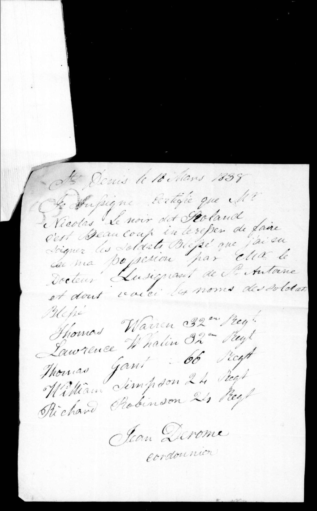 Le déposant déclare qu'il fut forcé par le général Brown de conduire à Saint-Hyacinthe les prisonniers Simon L'Espérance, Paradis et autres. Témoignage du docteur Joseph Lusignan, de Saint-Ours, en faveur de Nicolas Lenoir dit Rolland. Noms des soldats anglais blessés à la bataille de Saint-Denis. Ce dossier fait partie d'un ensemble de documents intitulé : Etat des esprits (1837), Renvois de commissions - charivaris - attaques à main armée - assemblées de protestation - batailles de Saint-Denis et de Saint-Charles