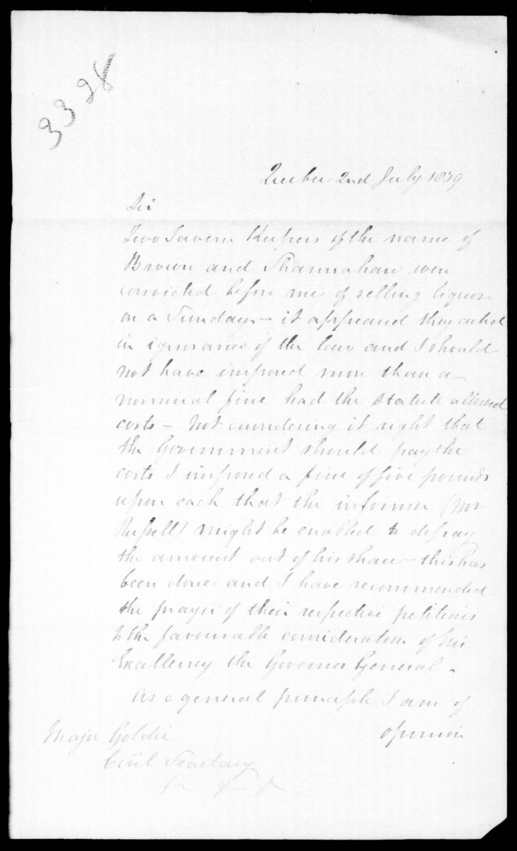 - Il a condamné à l'amende deux taverniers qui ont vendu des liqueurs le dimanche. Ce dossier fait partie d'un ensemble de documents intitulé : Correspondance des officiers du gouvernement en 1837, 1838 et 1839. Thomas Ainslie Young, chef de police à Québec