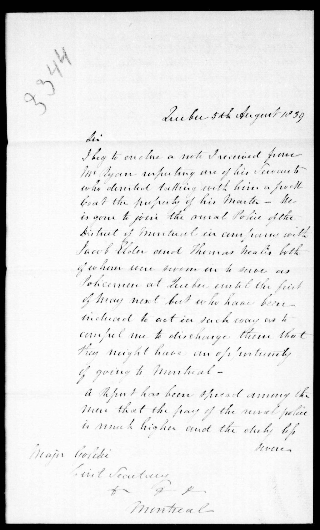 - Lettre de Thomas Ainslie Young, chef de police à Québec, au major Thomas N. Leigh Goldie, secrétaire civil