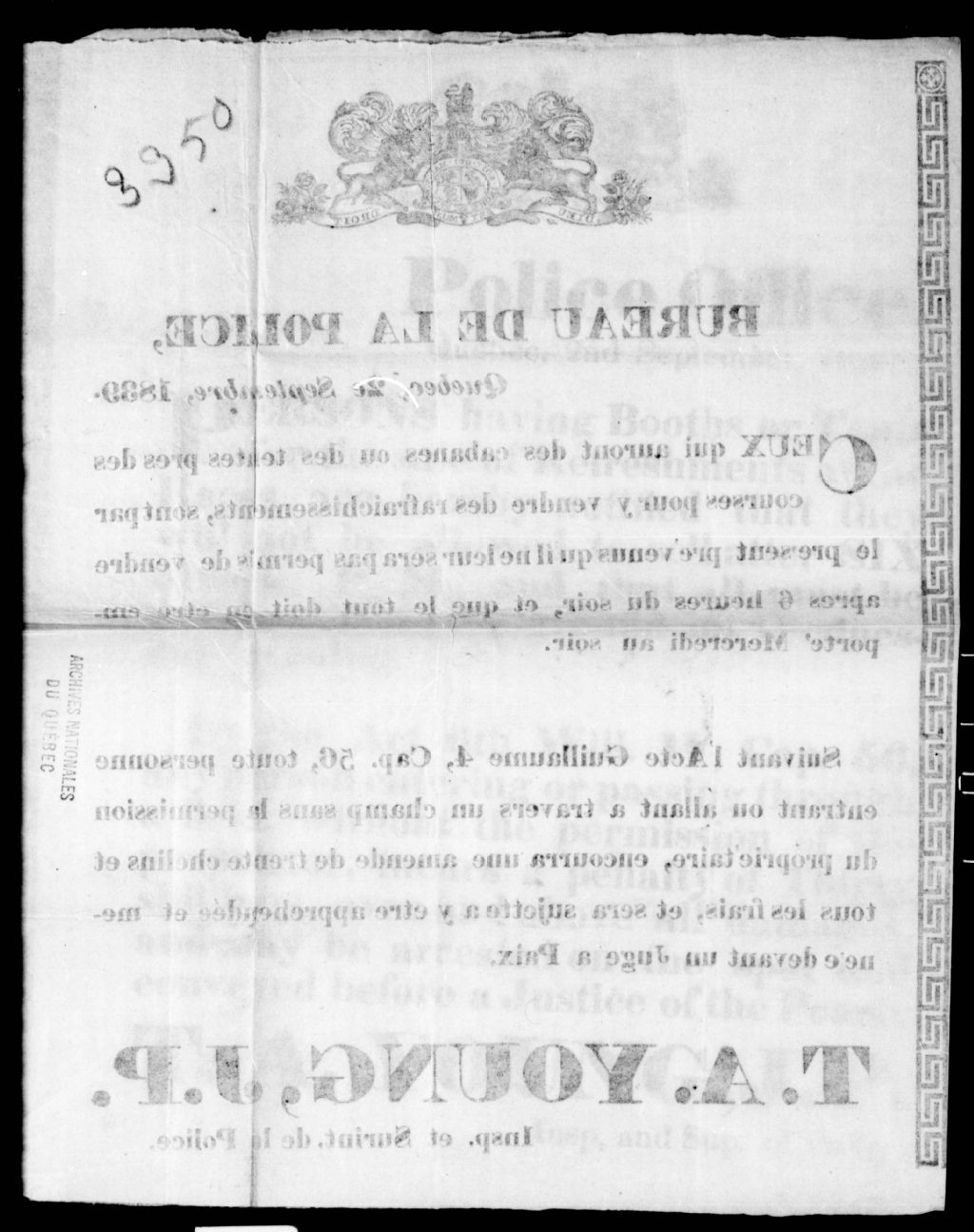Circulaire imprimée à propos de la vente des liqueurs sur les champs de course, vers 1839, Archives nationales à Québec, Fonds Ministère de la Justice, (03Q,E17,S37,D3350).