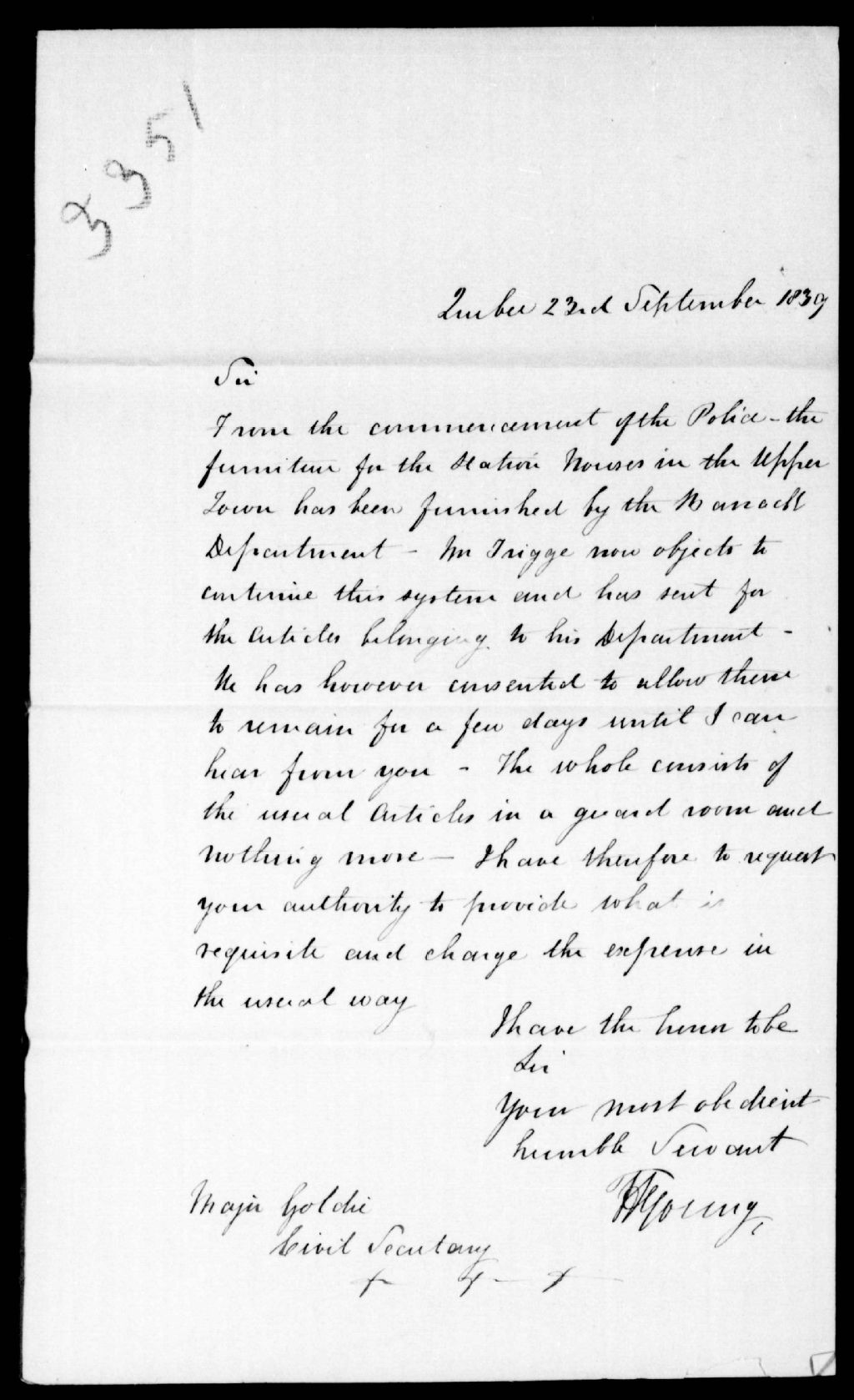 - Lettre de Thomas Ainslie Young, chef de police à Québec, au major Thomas N. Leigh Goldie, secrétaire civil