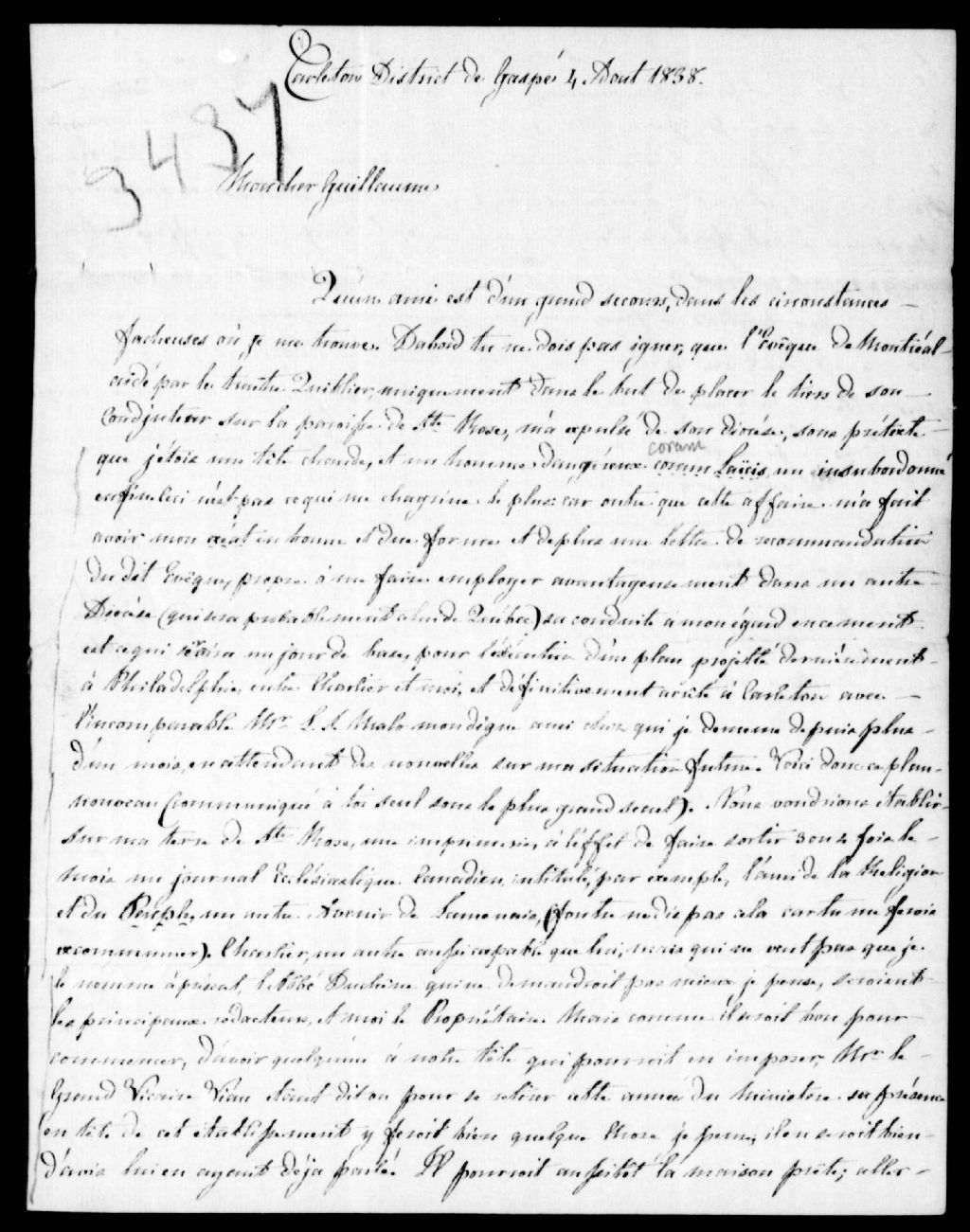 Curieuse lettre de M. Turcotte, ancien curé de Sainte-Rose, à Guillaume Vallée, médecin, à Montréal, datée de Carleton, district de Gaspé