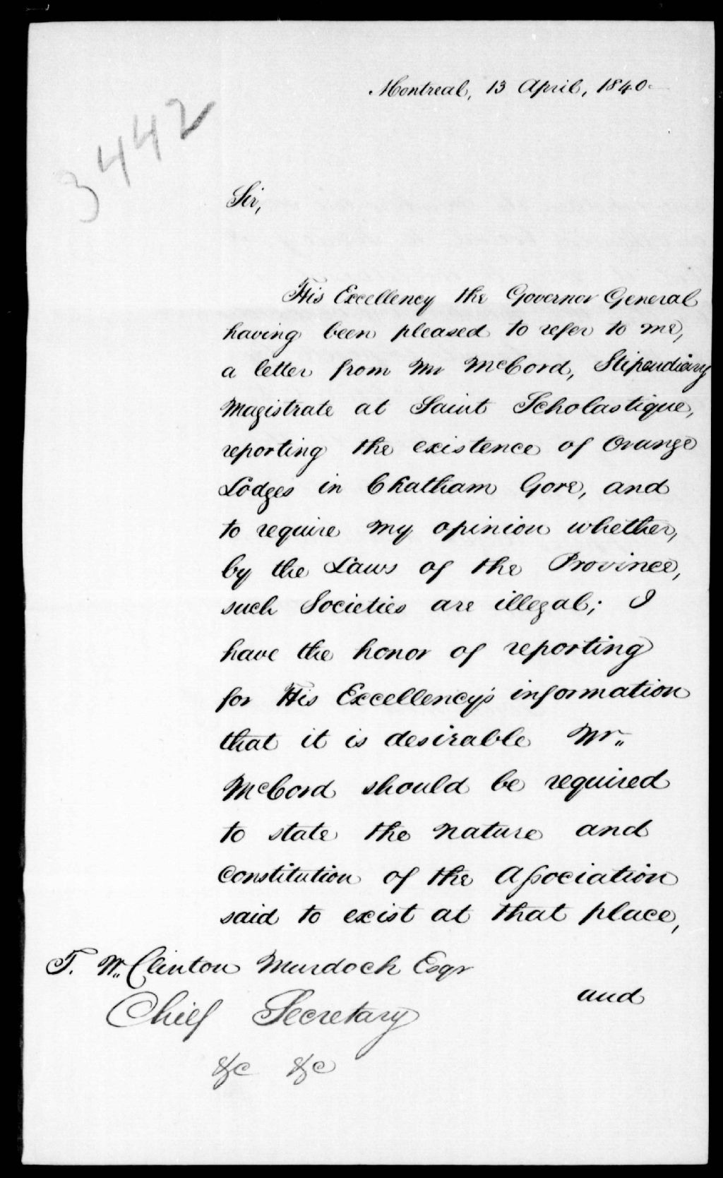 - Certaines questions à poser à M. McCord, à propos de cette loge d'orangistes. Ce dossier fait partie d'un ensemble de documents intitulé : Correspondance des officiers du gouvernement en 1837, 1838 et 1839. William King McCord, magistrat stipendiaire à Sainte-Scholastique