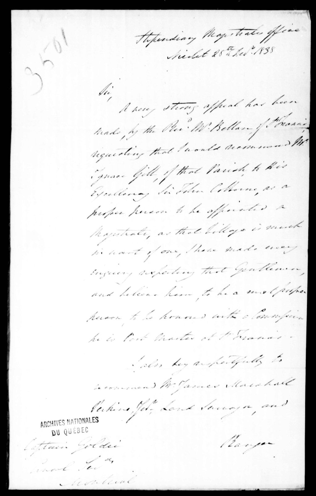 Lettre de W. C. Hanson, magistrat stipendiaire à Nicolet, au capitaine Goldie, 28 décembre 1838, Archives nationales à Québec, Fonds Ministère de la Justice, (03Q,E17,S37,D3501).