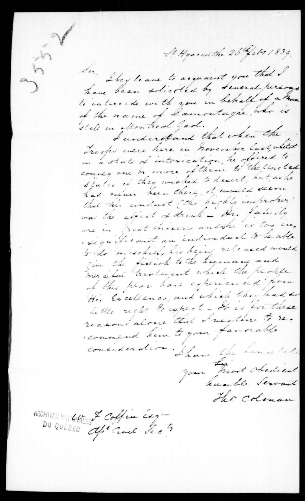 - Lettre de Thomas Coleman, magistrat stipendiaire à Saint-Hyacinthe, à W.-F. Coffin