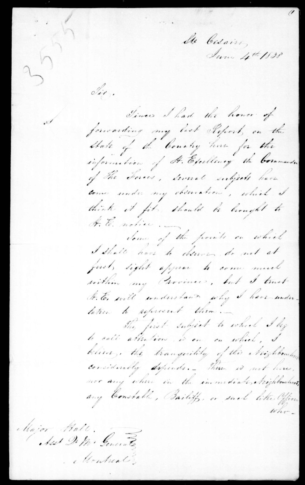 Lettre du major F. A. Mackenzie Fraser au major Hall, datée de Saint-Césaire, 4 juin 1838, Archives nationales à Québec, Fonds Ministère de la Justice, (03Q,E17,S37,D3555).