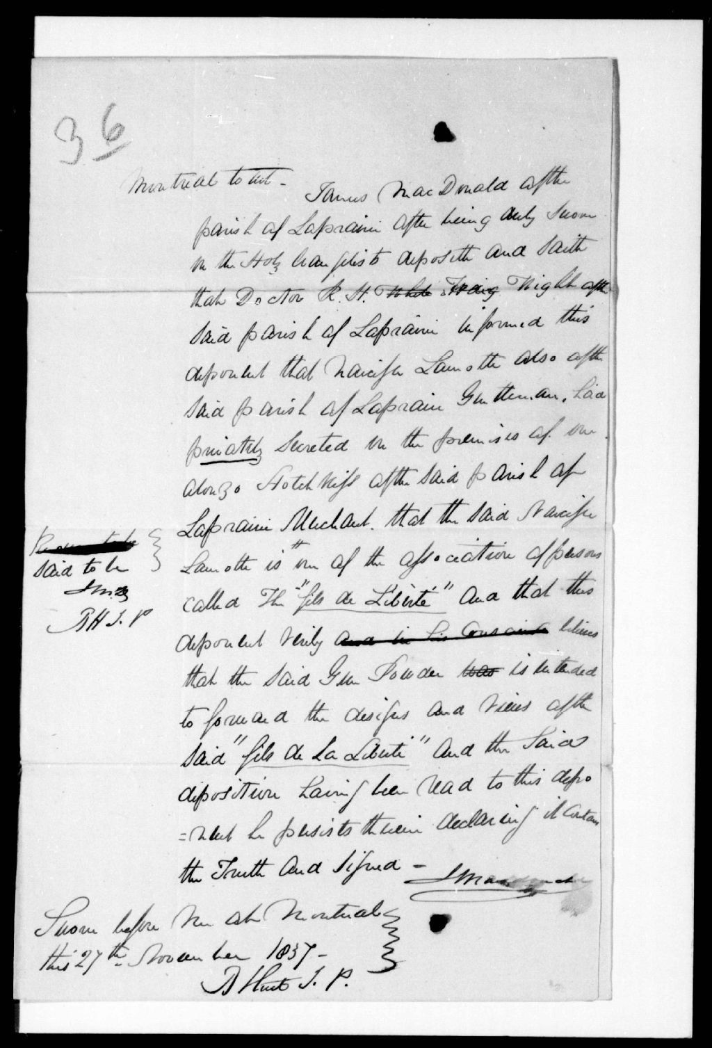 - Le déposant déclare que Narcisse Lamothe de Laprairie appartient à l'association des Fils de la Liberté. Ce dossier fait partie d'un ensemble de documents intitulé : Les Fils de la Liberté