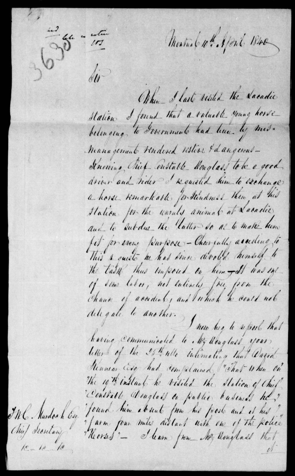 - Il se plaint d'un rapport fait contre lui par M. Kinnear à propos du constable Douglas absent sans permission de son poste. Ce dossier fait partie d'un ensemble de documents intitulé : Lieutenant-colonel Bartholomew Conrad Augustus Gugy, inspecteur des magistrats stipendiaires