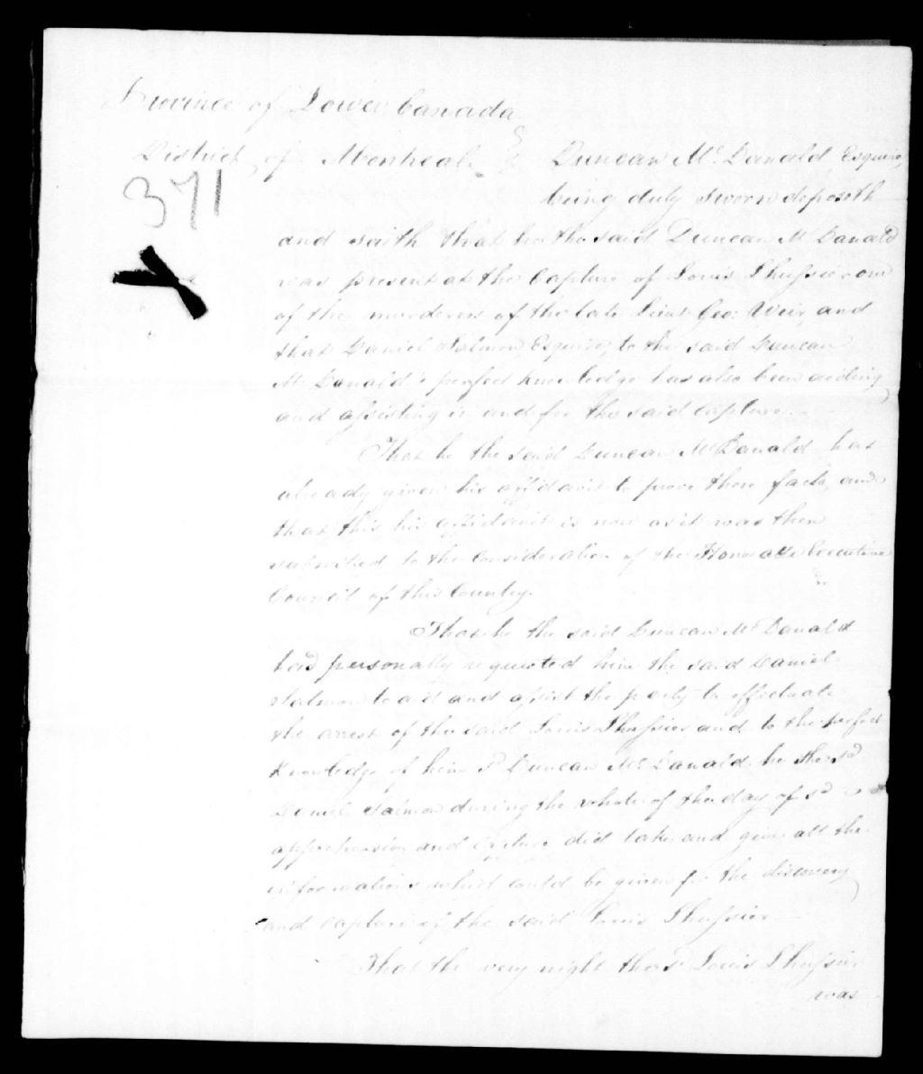 - Copie de l'affidavit de Duncan MacDonald, concernant l'arrestation de Louis L'Huissier et la part que Daniel Salmon a prise à cette arrestation