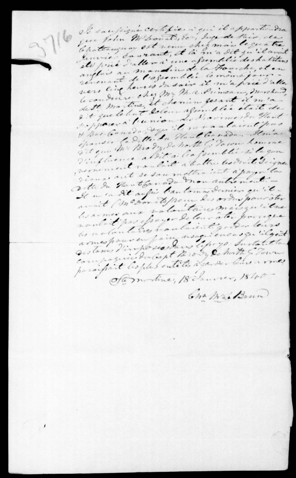 - Longue lettre à propos de la conduite irrégulière de M. John Macdonald dans les causes des porteurs de licences de tavernes. Déposition de C.-M. Le Brun contre John Macdonald. Ce dossier fait partie d'un ensemble de documents intitulé : Edward Henry Bowen, magistrat stipendiaire à Châteauguay