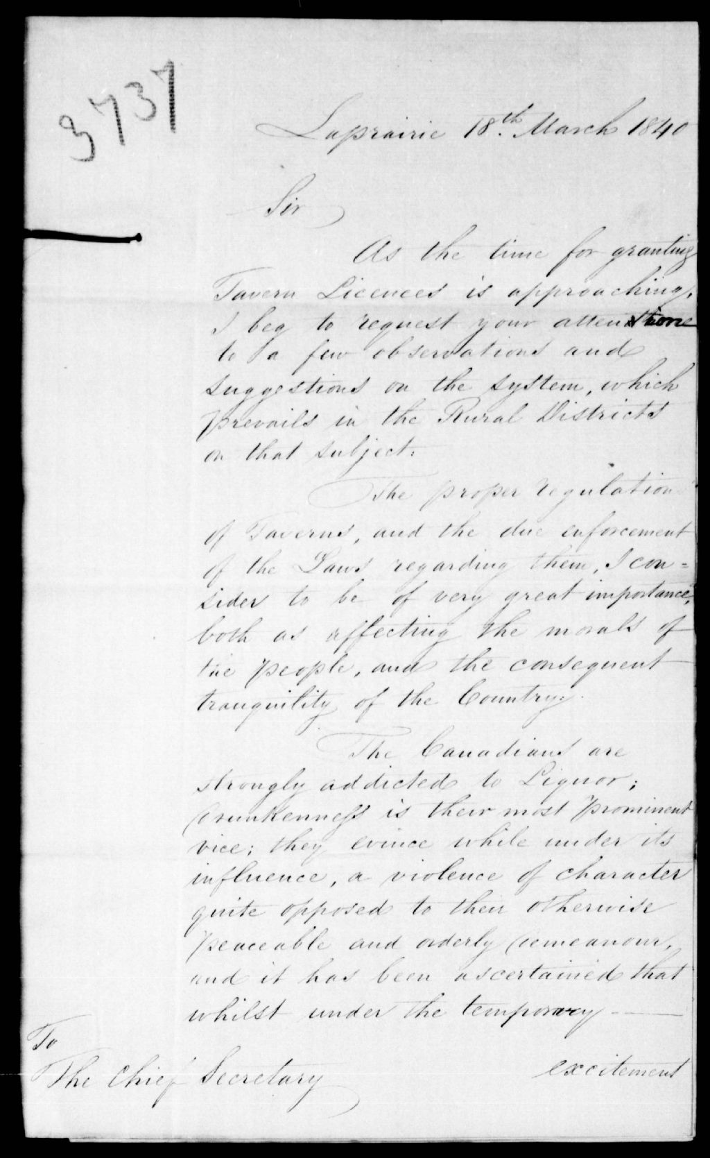 Lettre de Charles Wetherall, magistrat stipendiaire à Laprairie, au secrétaire en chef