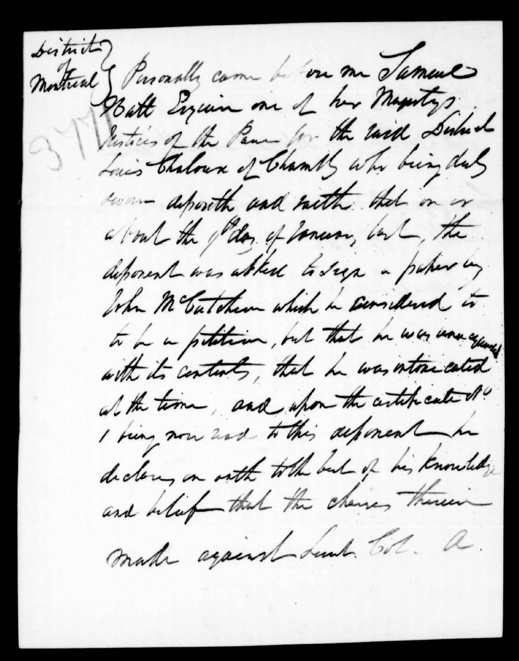 Déposition de Louis Chaloux. Il déclare qu'il était ivre lorsqu'il a signé une déclaration contre le lieutenant-colonel de Salaberry