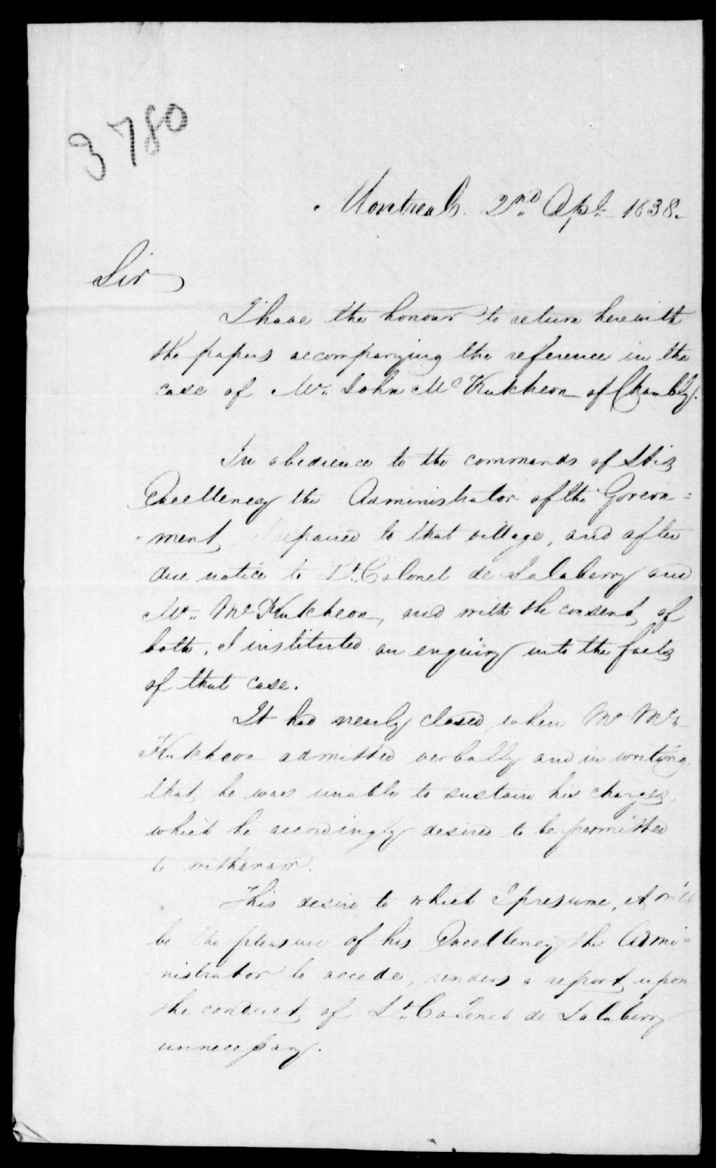 - Il a fait enquête à propos des accusations portées contre M. de Salaberry. John McCutcheon ne mérite pas qu'on s'occupe de lui. Ce dossier fait partie d'un ensemble de documents intitulé : Accusations contre les officiers militaires en garnison à Chambly