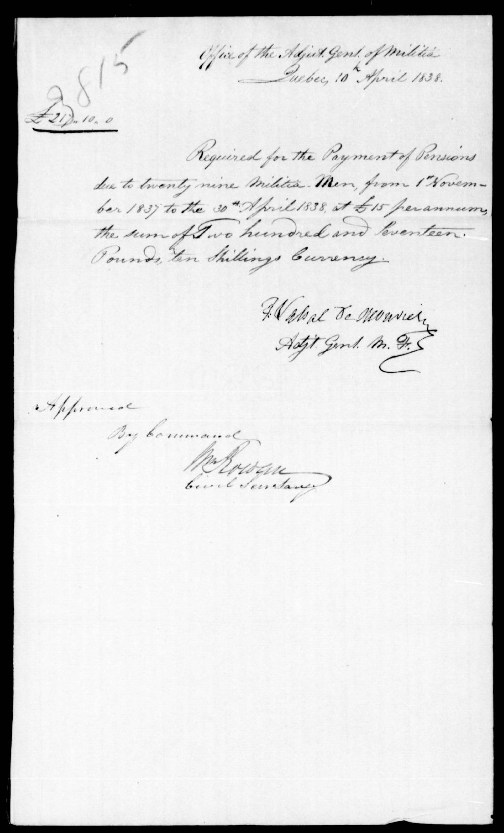 - Il demande une somme de £ 217. pour solder les pensions militaires. Ce dossier fait partie d'un ensemble de documents intitulé : Affaires militaires