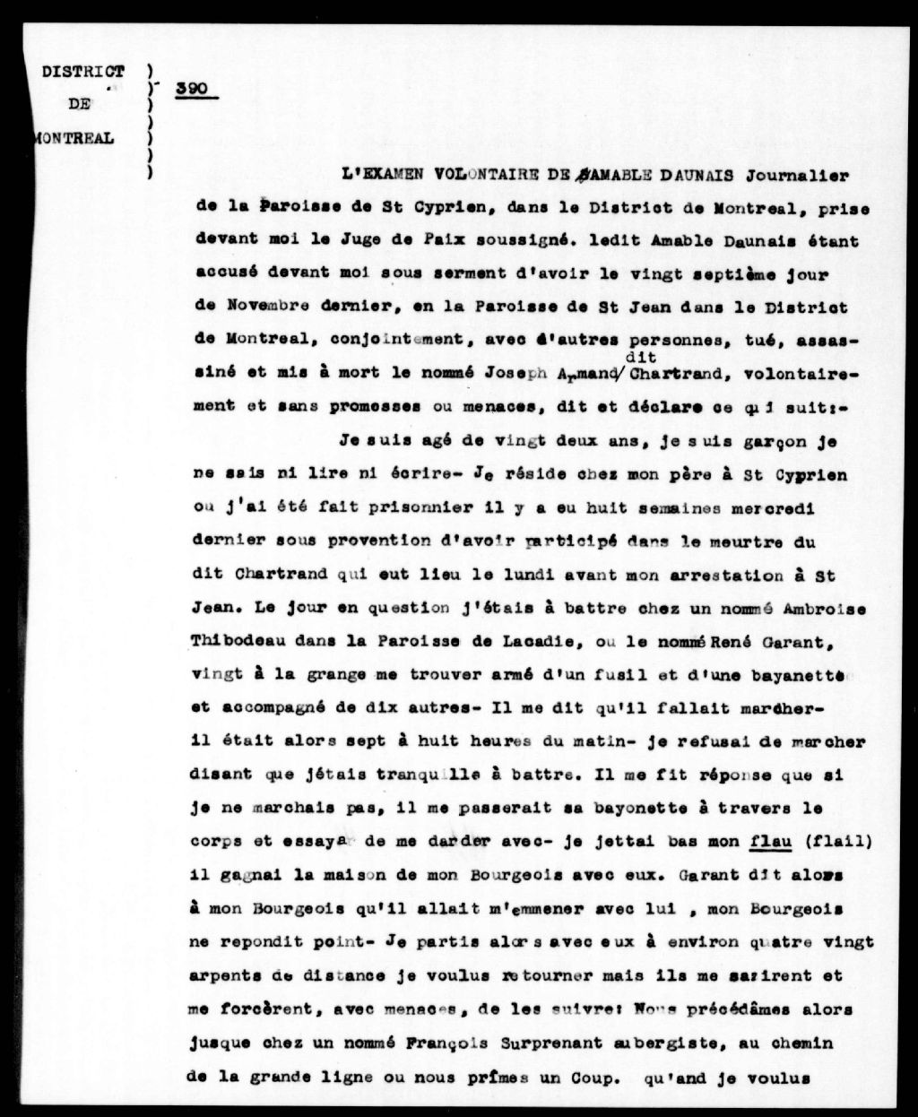 - Le déposant donne les noms de ceux qui composaient le groupe qui assassina Chartrand. Détails sur les circonstances de l'assassinat. Ce dossier fait partie d'un ensemble de documents intitulé : Assassinat de Joseph Armand dit Chartrand, de l'Acadie (27 novembre 1837)
