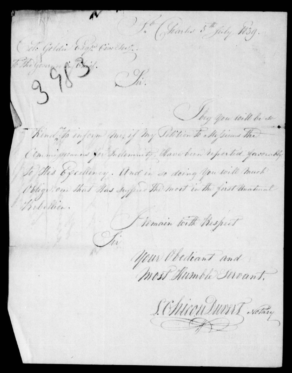 Lettre de L. Chicot-Duvert (Chicou-Duvert) au capitaine Goldie, datée de Saint-Charles