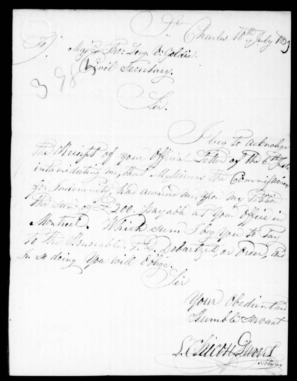 - La somme qui lui est allouée comme compensation sera payée à M. Debartzch. Ce dossier fait partie d'un ensemble de documents intitulé : La Commission des indemnités pour les pertes subies pendant l'insurrection de 1837 et 1838