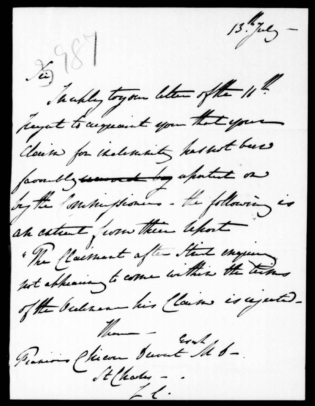 - Les membres de la Commission ont rejeté sa demande d'une indemnité. Ce dossier fait partie d'un ensemble de documents intitulé : La Commission des indemnités pour les pertes subies pendant l'insurrection de 1837 et 1838