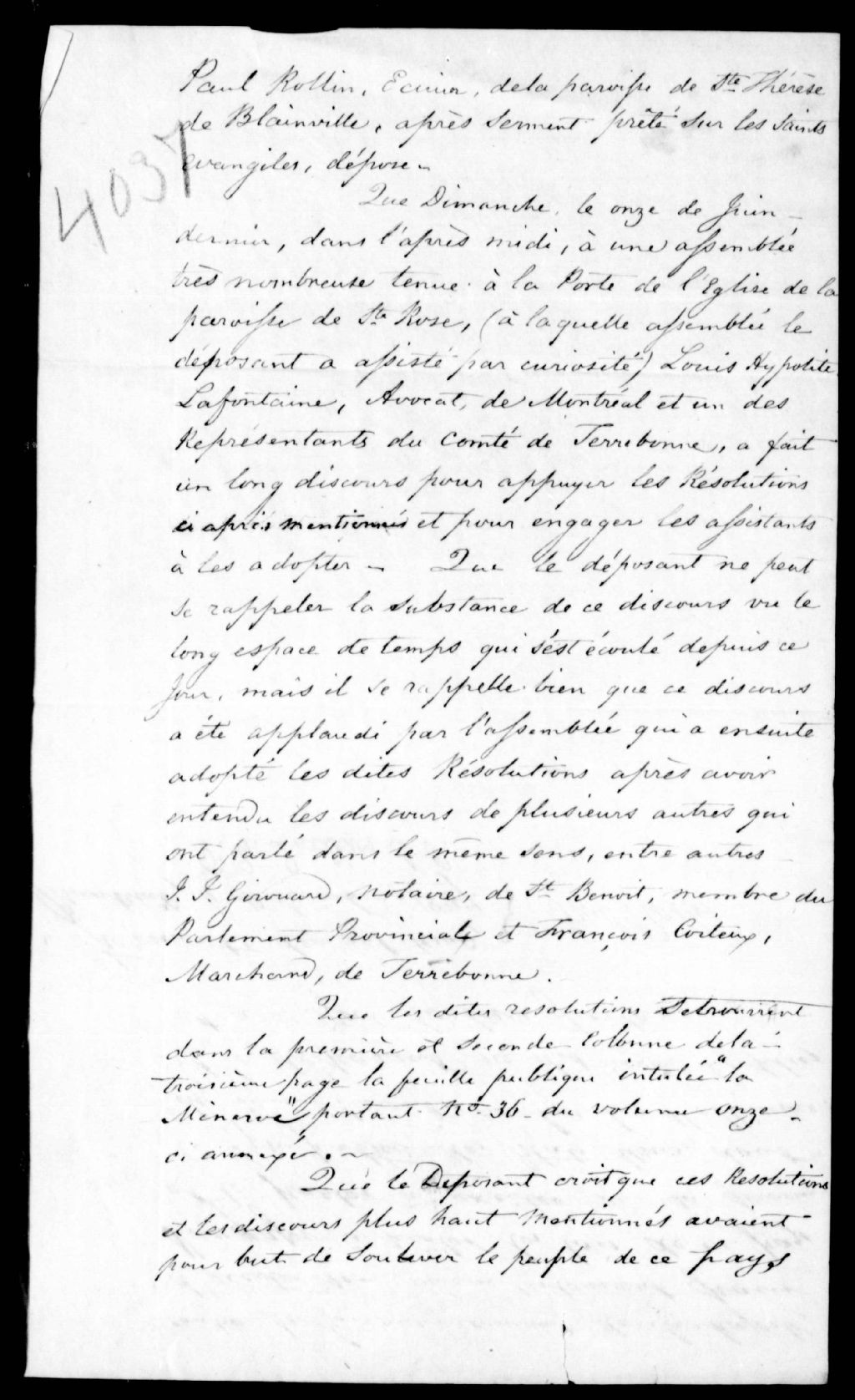 Déposition de Paul Rollin, de Sainte-Thérèse-de-Blainville, contre Louis-Hippolyte Lafontaine
