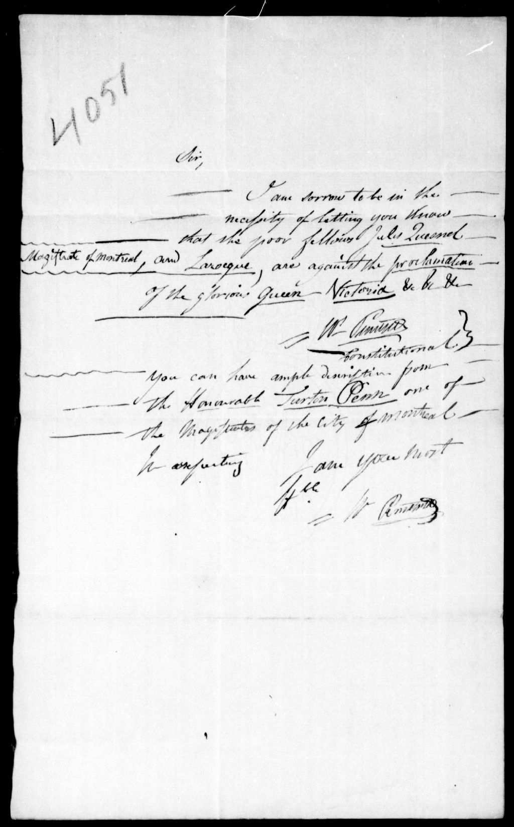 Lettre anonyme, vers 1837, Archives nationales à Québec, Fonds Ministère de la Justice, (03Q,E17,S37,D4051).