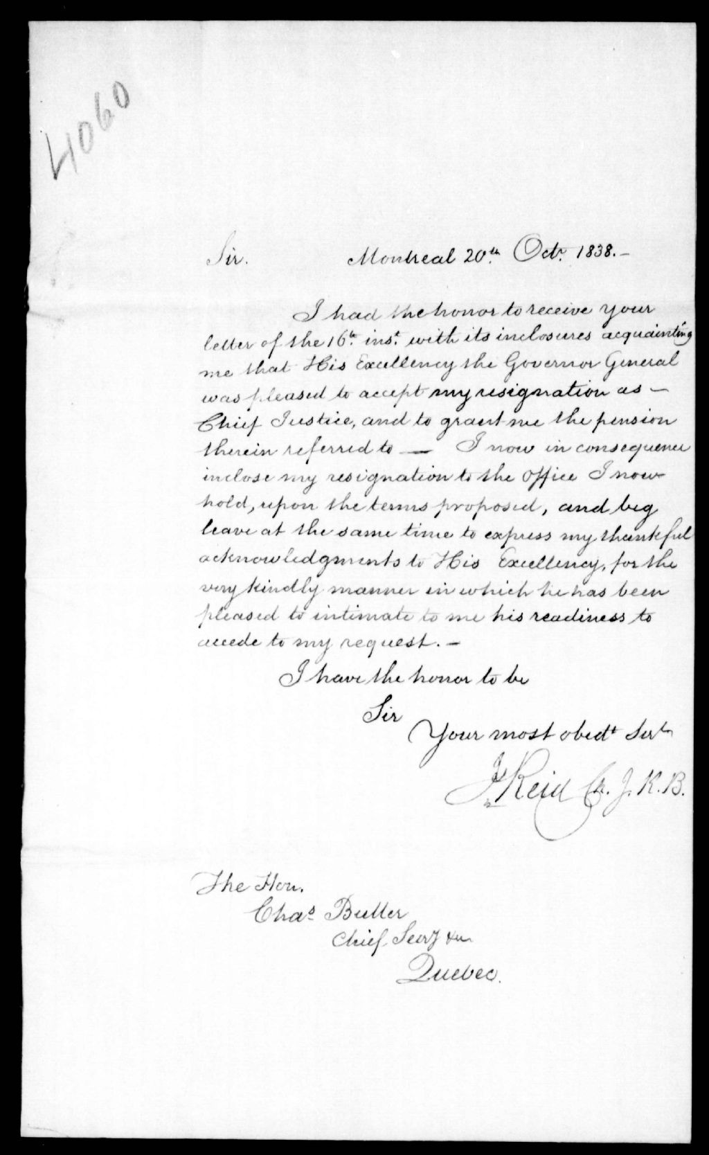 Lettre de James Reid, juge en chef du district judiciaire de Montréal, à l'honorable Charles Buller