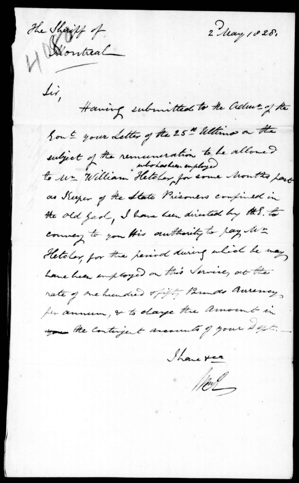 - M. William Hetcher recevra la somme de £150 pour ses services à la prison de Montréal. Simple brouillon écrit à la hâte. Ce dossier fait partie d'un ensemble de documents intitulé : Lettres des secrétaires privées à diverses personnes